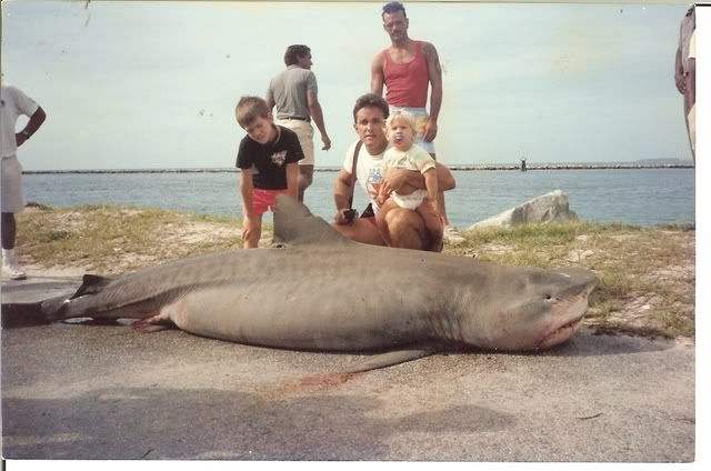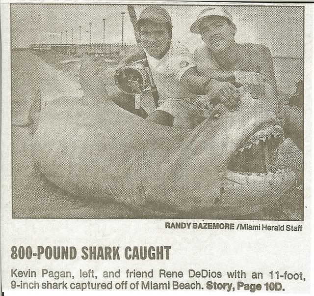 Capt Kevin Pagan caught this beast.After the old South Beach pier was torn down we missed our pier but were determined to continue our tradition of shark fishing the area.So we started to fish the beach because the pier was gone but one year a violent storm caused quite a bit of beach erosion that now had the waves lapping at the South Pointe park boardwalk which happened to be right next to the jetties of Goverment cut..Well instead of fishing on the beach we could now set up right on the boardwalk row or paddle our baits out and fish more comftarble on the wooden boardwalk.In those days no one fished the boardwalk more then Kevin Pagan.One night he was rewarded for his dedication with the huge 770 lb tiger shark.