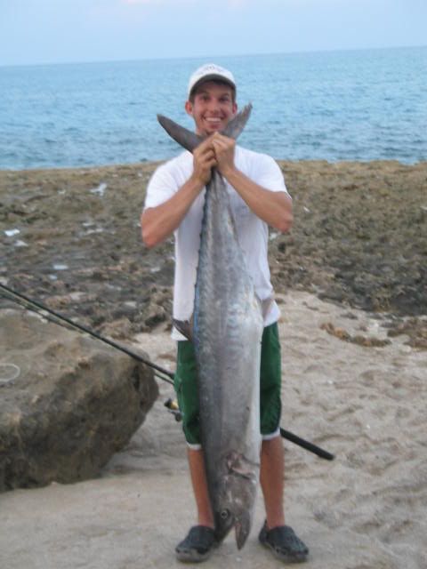 For a week I had plans to fish with Josh on his home turf once he made it down from Canada.I picked up my buddy Ken at his house and headed north to try our luck with Josh.Ken brought the fresh fozen bonitas his captain friend Chad hooks him up with.Ken's been anxious to get back on the beach to fish since he's been laid up nursing a back injury he suffered in a car accident.On I-95 driving north i get a call from Josh ("Blacktip Hunter")that he just caught a 60 lb kingfish from the beach and i'm excited for him and anxious to take a look at the huge king so i speed up to get there quicker.When we get to the spot and unload our gear Josh shows us the fish that he caught ona shark rod using a half of a bonita.This King is huge ,,,,,,it's bigger then any i have seen caught from any shoreline beach,bridge or pier-it's gotta be close to 50 lbs I estimate; with a huge head and long streamlined body.I tell Josh to take it and have it weighed because this is one of the biggest kingfish ever from a Florida beach but all he wants to do is shark fish and does'nt seemed too concerned about the fish's weight.