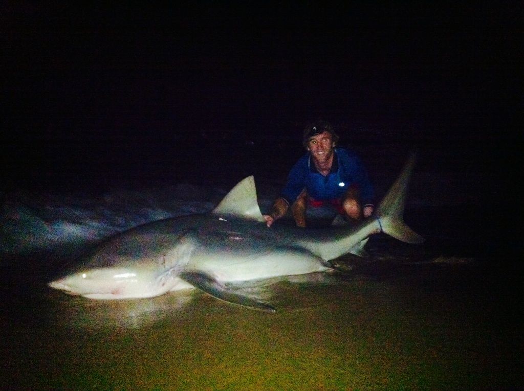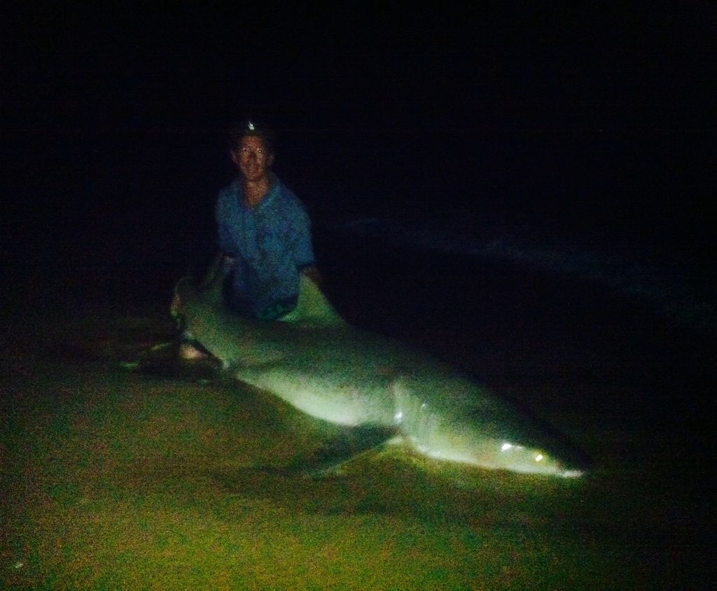There wasn’t any action until close to midnight when one of Brett’s rods goes off. The hooks are set but sadly again not too much weight is felt on the other end. After a couple of minutes a very green whaler hits the sand.