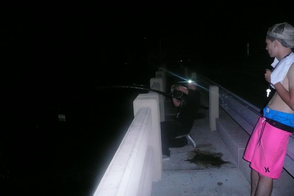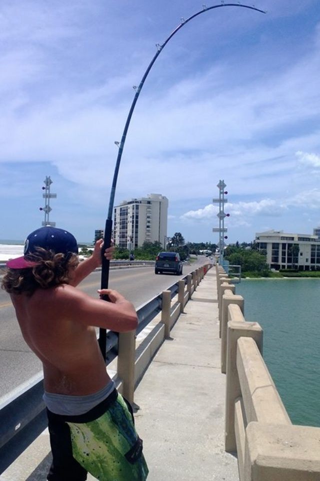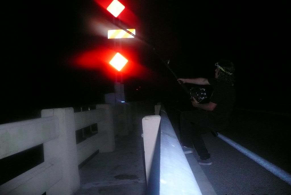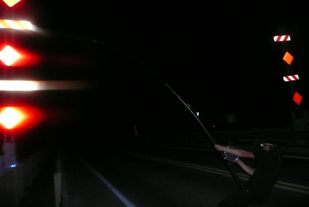 so i drop a bait and hook up 10 minutes later, it rips drag on hookset and charges the bridge, i bow up to the grips and the rod lifts me off feet i thought i was going to fly offf the bridge. the fish dives into the pilings and shreds my 500 lb leader and my rod flings up and i fly back. rerig and drop a bait again, an hour goes by and the reel sings. and im onto a small bull.