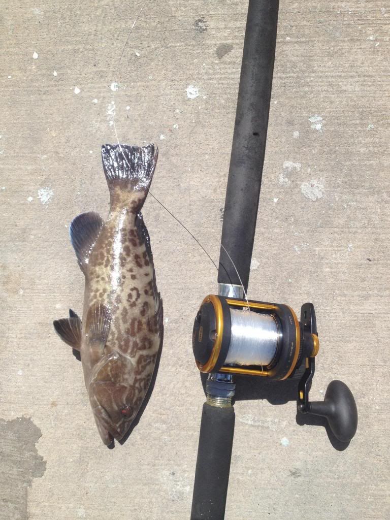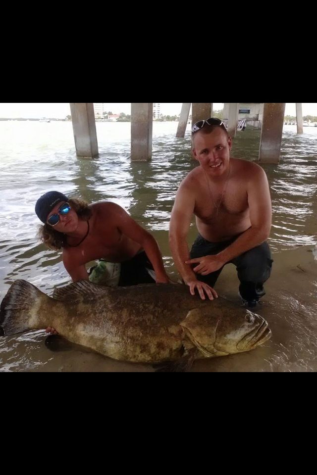 after i bring the ray up to the bridge i see that its still slack so i drop a mack into the piling on my 12/0 as it sinks down to the bottom i feel my ling get tight and run out of the piling i run away and bow the rod over the rail. an awesome tug of war and the fat jewfish was subdued
