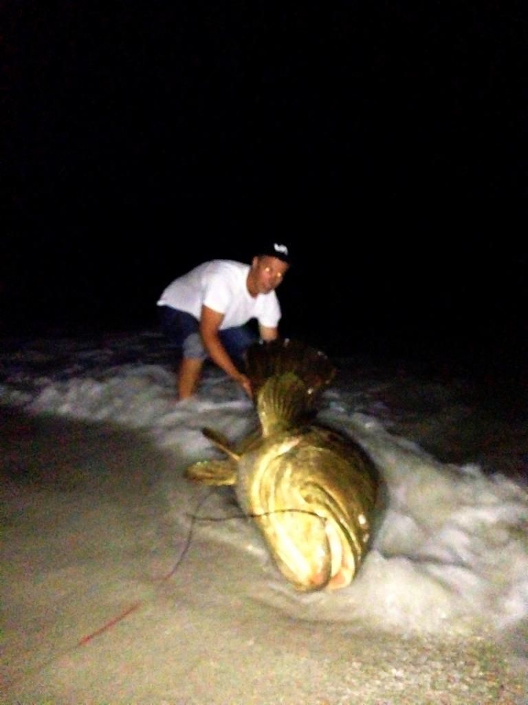 Thanks will! It was about a 25 minute fight on 50lb with 180lb wire and 8/0 j hooks! Very weird fight, sluggish but very powerful, it kept trying to tangle in the other lines. Never expected a jewfish off of this beach!