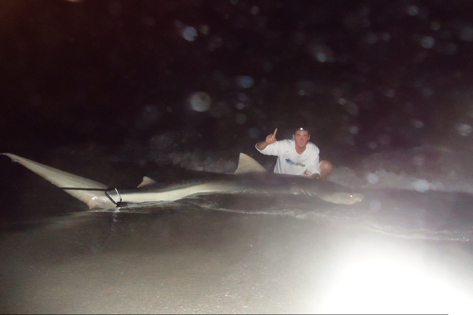 went out last week too soak a few baits after work and a new friend came with cause he wanted to see how it was done from the beach, so we got to the beach got all set up and I explained to him how this will all work and how to use the reels while I paddle out baits. about 2 hours go by maybe and my 80 starts to roll steady and just before im about to set up it dropped the bait, it picked it right back up though and then dropped it again and that was it. I still had bait and the fish left the bait alone. not to much longer after that hit my friend had to go home and after that I got hooked up on my 14/0 to this big fish. I dident get a measurement but I was able to take a few pictures.