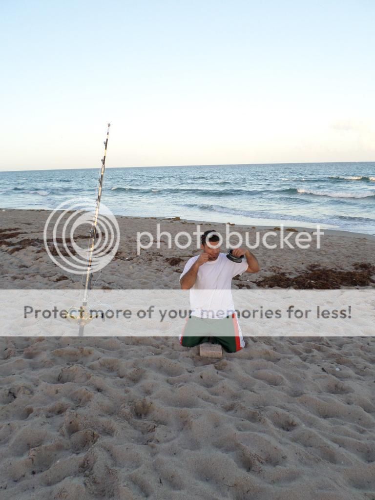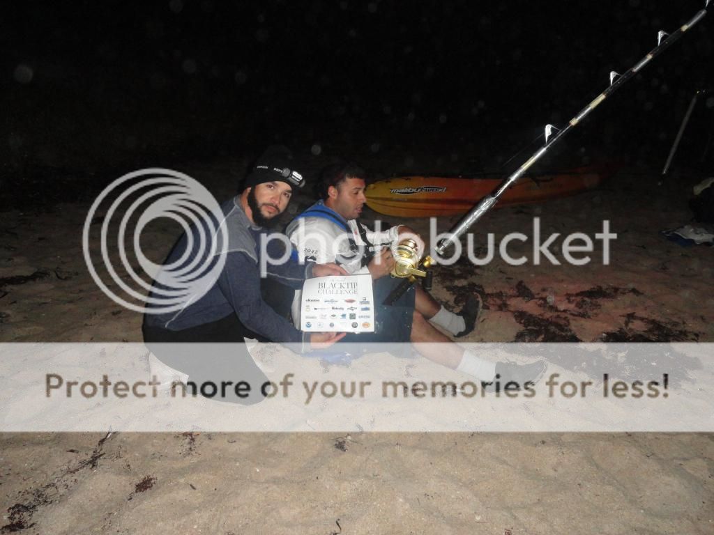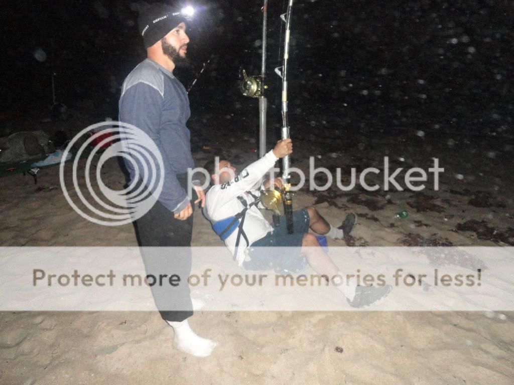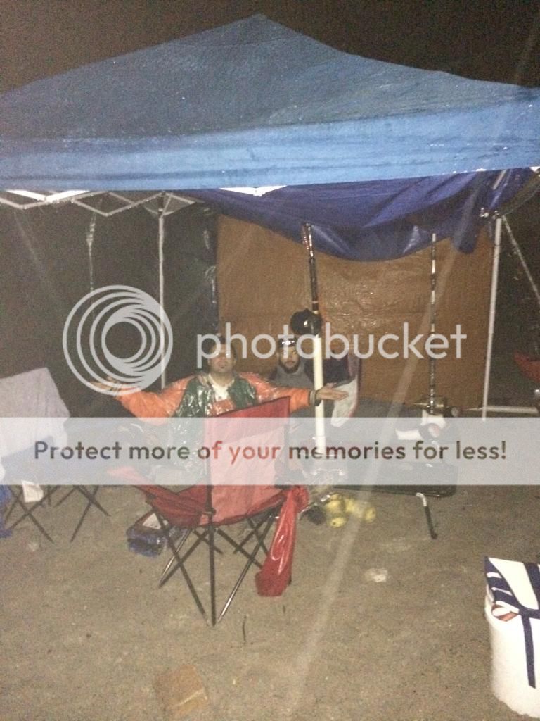 We headed north and met up with Jose at my house loaded up the trucks and continued to drive north.It was pouring rain all the way so it was looking like it was going to be a nasty night. After arriving to the beach we set up camp and the rain was coming down so we kayaked our baits out in some pretty rough water but it had to be done if we wanted to fish!!! We somewhat dried up but our canopy leaked like crazy and we just waited!!!