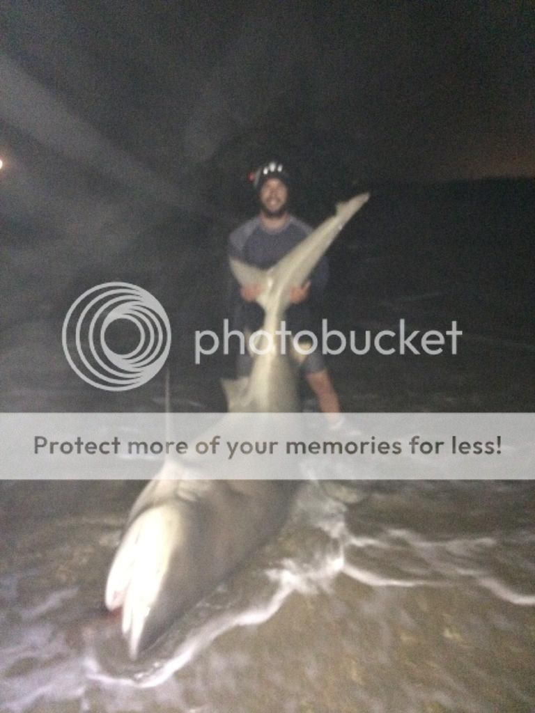 The sun was setting and no bites we reeled the lines in and put out fresh baits at sunset. Then it happened we had our first hit just before midnight and Ray was on:)After quick work on the 12/0 duel with Bullbuster Braid and Mono the shark was landed and it was a fat female 8'9" bull