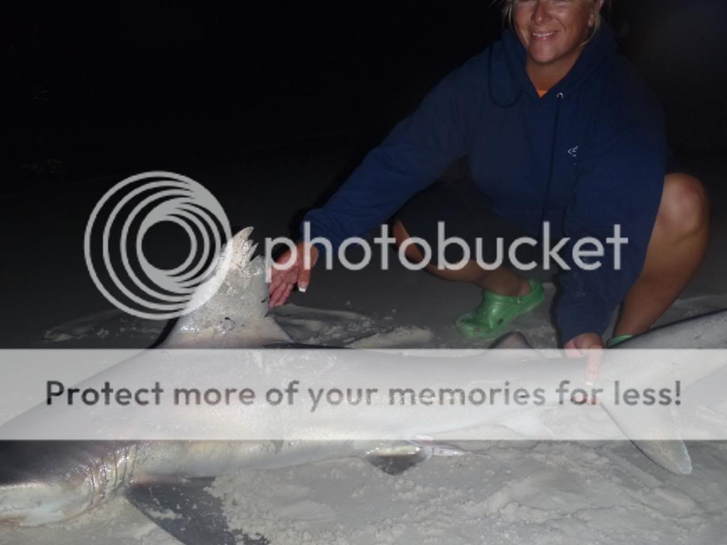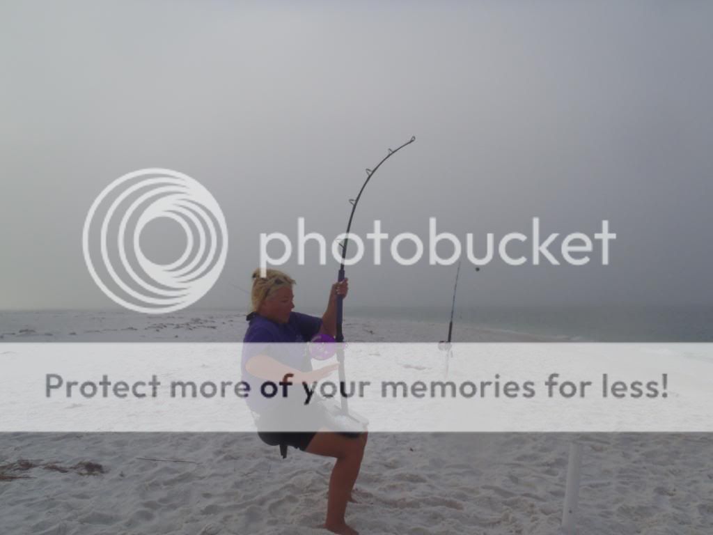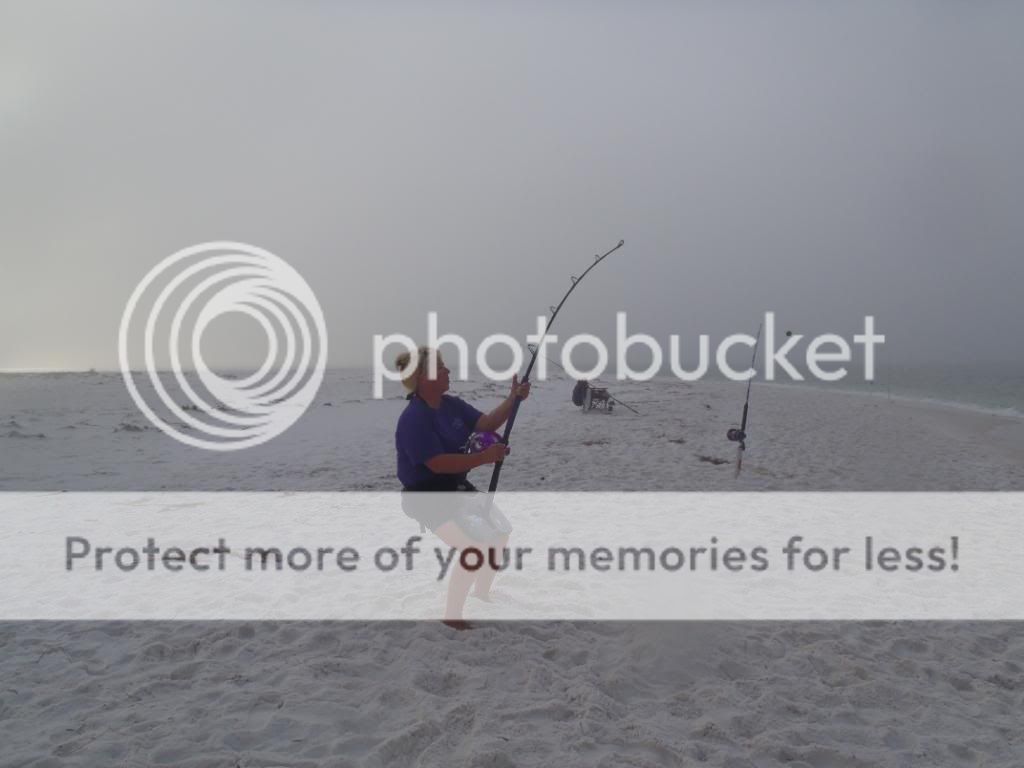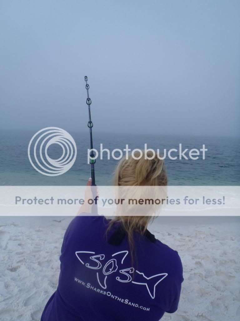 Well they are not out of the parking lot good and my 80w clicks a few small times and slacks up. We wait and finally get the hook home. Tara has been very patient and I figured it was her turn to put a shark on the sand.