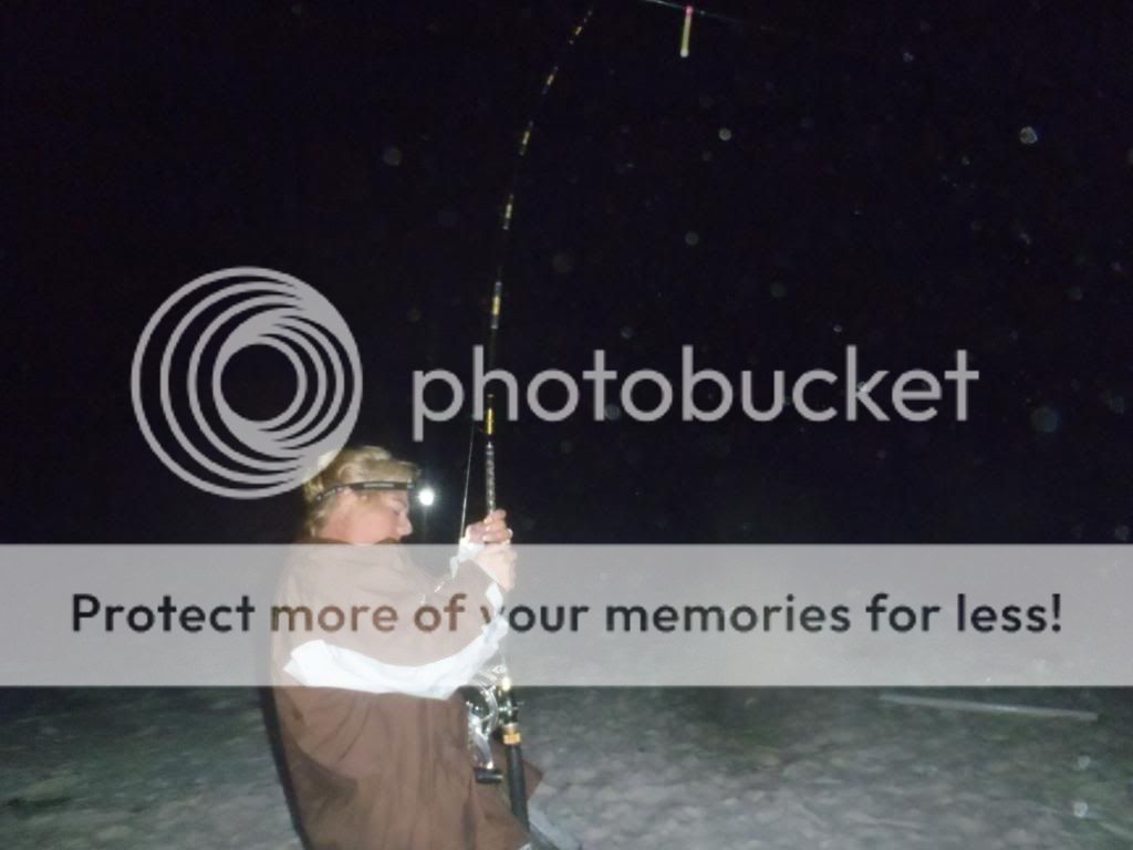 As darkness falls all the rods start getting hit....lot of click click slack slack. Then finally her 12/0 does a little sing and she drives the hook home!