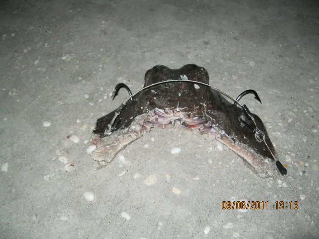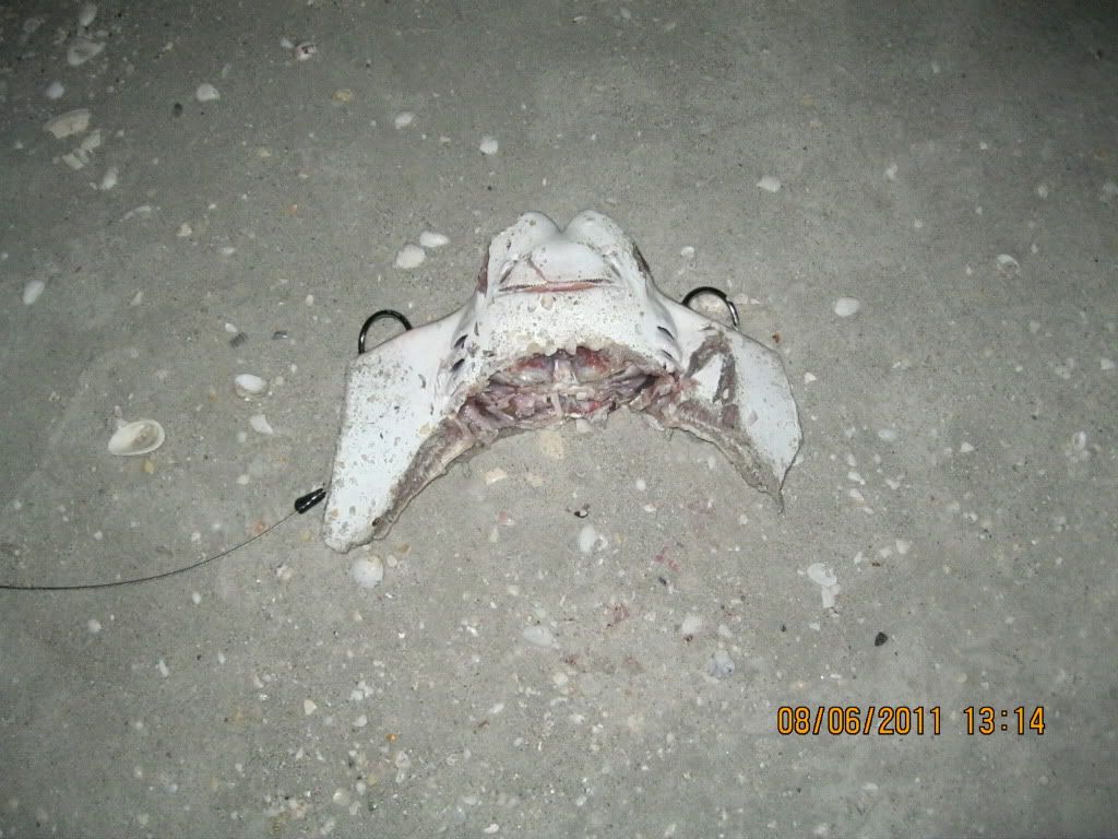 went down to sanibel beach over the weekend. had the wife and my little dog with us too. wanted to enjoy the day chasing down snook and watching all the sea life around us. had brought 3 rods with me to fish later on that night and a good choice of bait. i had cownose rays and a pup shark for the nites dinner menu. baits were all yaked out by sunset, thats when i lit up the cigar and waited for the noise that we all love to hear. at first my 9/0 went off and i did the running man after letting the fish run for awhile, as soon as i put the reel in gear it was on i had 2 real hard head shakes and than all of a sudden i was at a stand still to my amazement i was hung up on somethn on the bottom. as i tried and tried to budge the line free i finally get it loose. as i reeled in the bait all i had was 2 hooks trailing and what my wife thinks could have been an eyeball on the end of one of the hooks. i wasnt sure what it was but believe me or not it sure did look like the remains of what could have been a sharks eyeball. later on my spinning reel gets blasted it had the pup shark on it, i wasnt able to set hook on it all nite. so when i reeled it in all that was left of the bait was a tail. as the nite got later it got quite and the bugs were out in full force neither bug spray nor citronella candles and long sleeve shirts and pants could keep me from getting my body bitten, thats when i knew it was time to slowly start packing up. i took things back to the cottage little by little leaving my last rod out in the water with a cownose as bait. i highly recommend not too leave your rod all by its self and unattended when packing up for the night. anything could happen.... the pics will explain my missed chance on a very nice fish with a very BIG biting radius!!