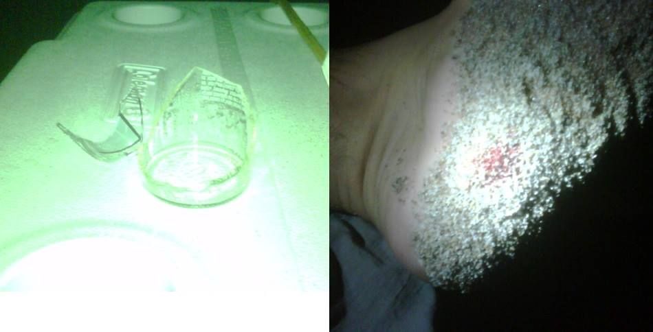 We went out the next week and the night was pretty quiet. The guys took off and I stuck around for a little longer. While I was packing up, I stepped on a broken beer bottle in the sand by the high tide mark. While it was bottoms up, it broke and a piece of glass came off the side and got me by the heel. I thought it was coral at first but I couldnt find anything. I found the glass 5 minutes later and looked for more. It was a small laceration but deep and the bleeding wouldnt stop, even after a rinse with cold salt water and packin cold sand on it. Remember guys, always clean up and ALWAYS pick up your GLASS. I was off the racquetball and volleyball courts for 10 days.