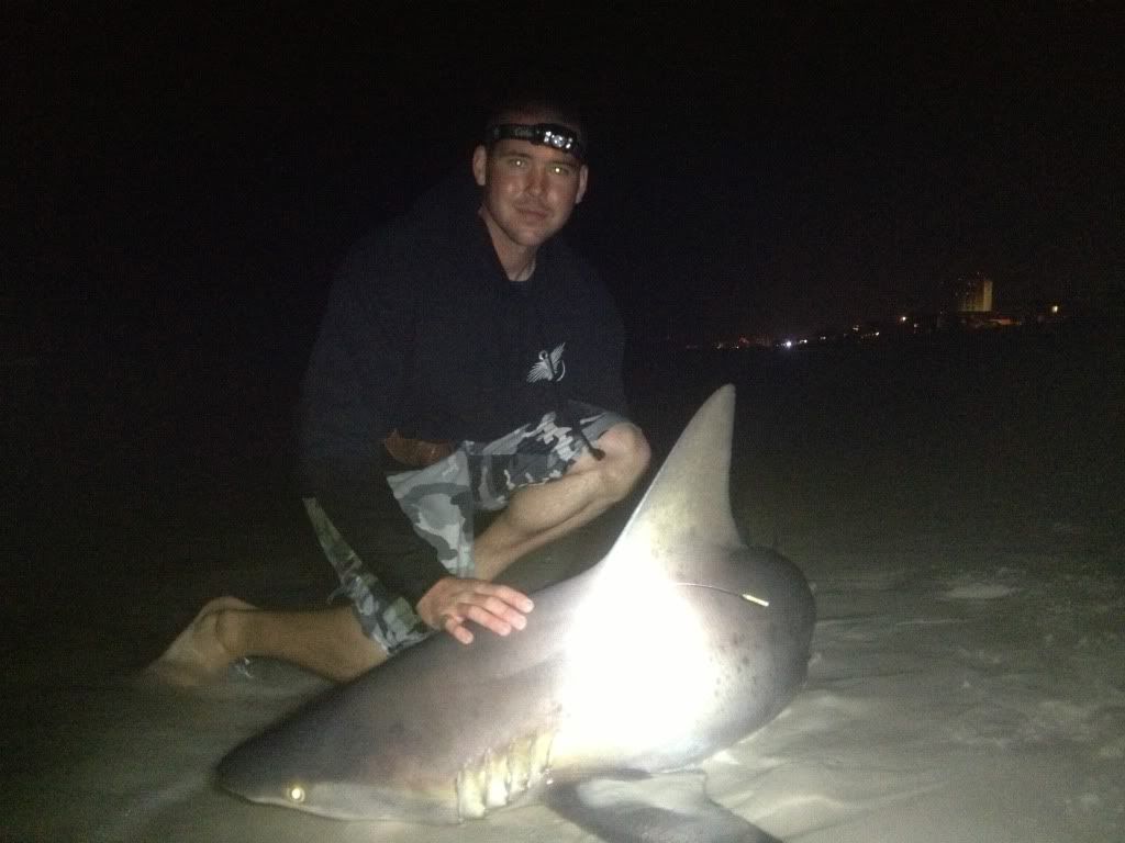 around 7 something pm we ordered Pizza and had it delivered. second slice in my 9/0 gets picked up about 200 yards out with a snapper head and its screaming! hook up and it takes a good 50 yards before stopping for breath then another 40 yard run. after its exhausted itself i get the upper hand and start cranking it in. every 45 seconds of winding would result in a good 20-40ft run then it would turn again. got her to the first sand bar and she took off and gave another go at freeing herself but in the end i landed this 78" sand bar. tagged and released.