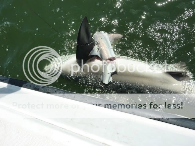 Got another bull about that same size about a month ago in the same place. We were anchored that time. Caught a 10" silver trout and put it on for bait. A three ft black tip (spinner) ate the trout so I put him on for bait. Caught the 7' Bull on the spinner but by then it was time to come in so I couldn't put the Bull on for bait. That's my story and I'm stickin' to it. I foul hooked the bull in the pec. Put a tail rope on him since he was a little unmanageable and had enough slack in the line that the spinner carcus to drift by in front of his mouth. He bit it twice, sucking in about half of it, while his tail was in the air tied to a cleat.