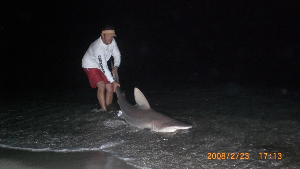 Back in the saddle after a long break from the beach.Hit the beach just before sundown at one of our local spots.The water was flat calm and crystal clear, the moon was full coming out of the horizon like a ball of fire,we put out a 9/0,two 12/0s and my 16/0 with less then fresh bait.Of course the 16/0 gets my biggest effort i paddle and paddle almost 500 yards and wonder will i get hung up and lose a bunch of line or will it be the lucky rod again.Lucky rod again at midnight this skinny sandbar shark was our only hit on this outing.Snapped some pics and turned her loose we were home by 3am and checking out Team Rebel's 3 sharks on boatless.Things will start heating up real soon,we're scouting some new territories this year.