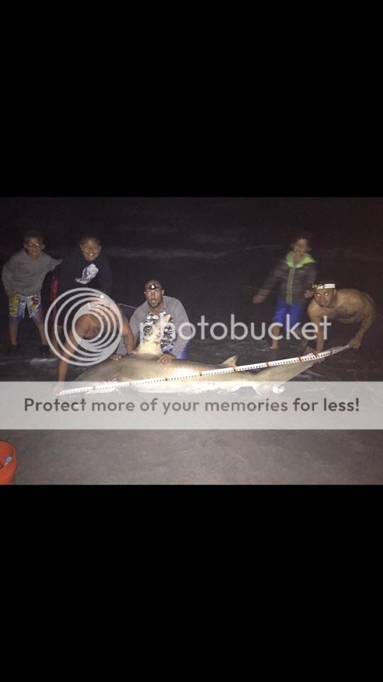 Finally hit the beach on thursday 3/26 tried to post on tapatalk but that didnt work!! Just now getting around to make a post.It was a thursday night me raymundo and shannon decided to hit the sand even though i had to work the next day i said the hell with it. We headed to the beach and the wind was blowing pretty hard from the s-se and the current was ripping. We spent alot of time getting baits out because of the wind and big surf but we managed to get all 5 rods out. So now starts the waiting game. As we are sitting around joking and talking we see shannons line slack and washed up on the beach so he reels it in and the bait is gone definetly was a hit but never heard or saw anything.. So after a few more hours of talking and joking some more my rod starts to bounce. Ray and I look at it and we thought it was the surf and then it did it again but this time pulled some drag. So we give it a second and then some more drag peels off, At this time i pick the rod up and the drag starts peeling off faster.. I let the fish take it and then i hit it with the running man and it was on..... And after short work on the Finnor 130(the first fish i caught on the new rod and reel , reel 1 year old and rod couple months)that im still getting use to. We land a feisty and pissed off little over 8ft hammer which we thought was a little bigger by the way it was fighting. But it felt good to finally hit the beach and land something after a really big dry spell!!!!First one of the year!!!