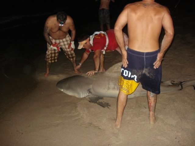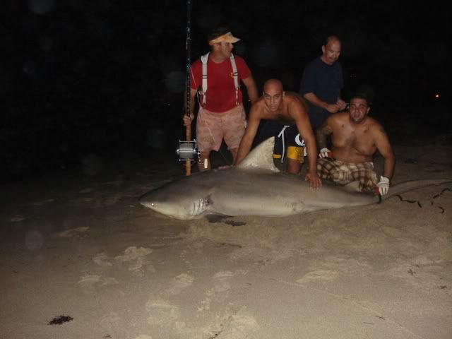 My buddies had been hounding me about hitting the beach so we decided on FridaY.WE GOT A late start were on the beach right at sundown and 1 hour later had out the 16/0,the 14/0 and two smaller combos.My all time favorite bait stingray (15 lb slabs) went out on the two big guns and of course the 16 goes out the farthest and is usually rewarded because of the extra distance.My friends Julio,Nick,Kenny,Mike,Chris and i were hanging out drinking our favorite cold beverage, looking at an almost full moon and contemplating what our luck would be that night.Well around 10 pm the 16/0 takes off in a constant steady pull without a bit of hesitation that indicated that the shark on the other end was big enough to swallow the 15 lb slab in one bite.In other words right away i knew i had a big shark on.After setting up i instantly felt the power of a big shark pulling drag and bending my 10 foot gator glass rod.My friends were busy putting on there gloves,getting the tail rope ready, video taping and everyone was commenting on the power of this shark.After putting on my shoulder harness and sitting down on the sand to do battle the strain was so great that the harness clips kept bending and coming off the reel.The shark would take 100 yards and i would retrieve 75 this went on for 45 minutes all the while the beast was heading north and i was having to fight him facing almost completely north on the beach,,,,,,i was't going to chase him and end up a quarter mile north of our base camp.We finaly got him in the wash tail roped him,snapped the pics and quickly released the pregnant female back into the water,she was 8 ft 8 inch and between 360-400 lbs.