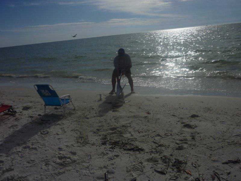 My friend Chris came down last week to do some fishing, our last trip together of the year. I was able to get a saturday off so we made a day of it. Chris had caught a nice 6ft+ blacktip a few days before so we were feeling good. Very nice calm day, we caught some ladyfish and mackrel in the surf. Immediately we ran out our fresh bait 300 yard right before the marker. no more than 20min and we had our first of two nice blacktips. Both left the water once hooked putting on quite a show. 5'3" and 5'5".