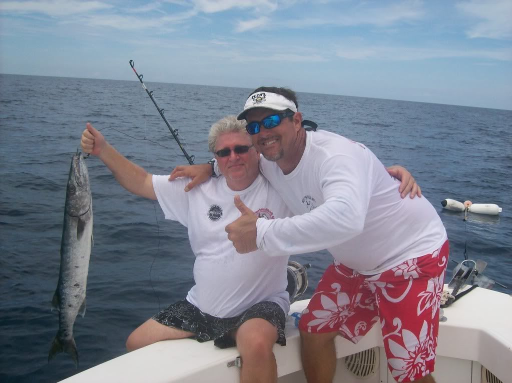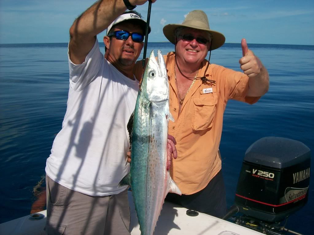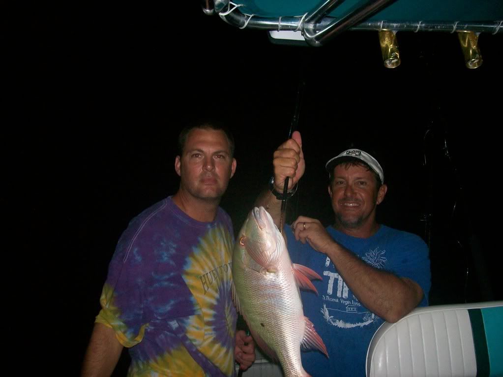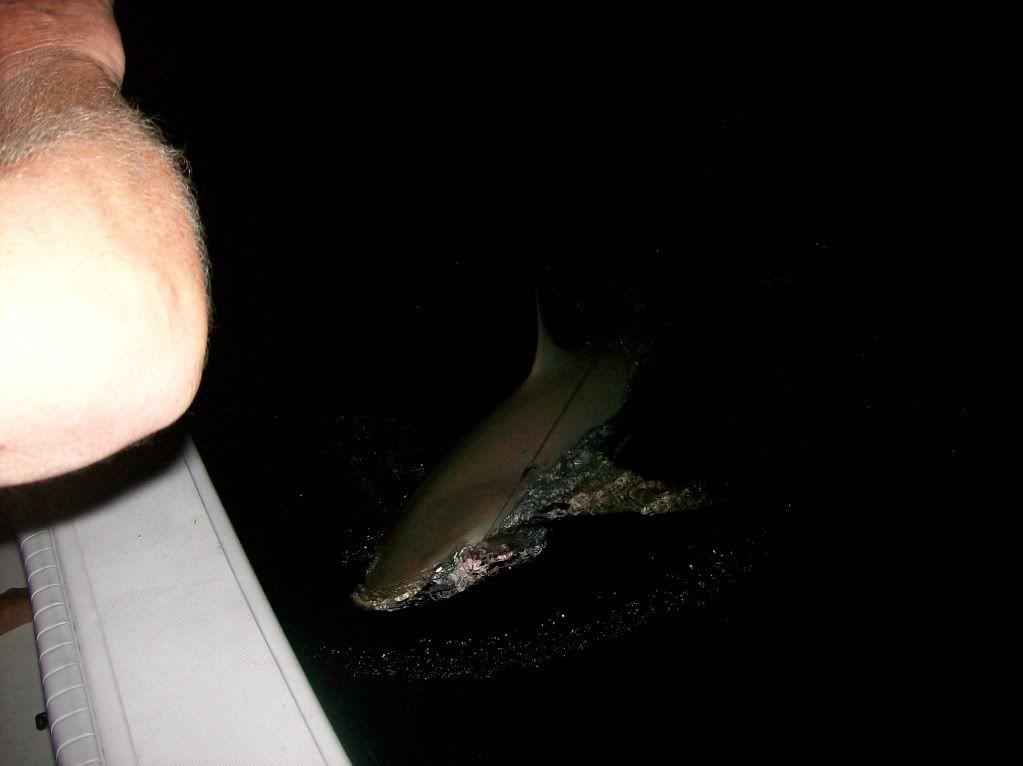 Sat night a little before dark we head out to the big drop off and start the sharkin. Again William cooks us stakes and great food. Just after we finish eating Joey gets hooked up on a shark on the 9/0. This 6 foot reef shark pulled Joey all the way around the boat giving him the fight of his life—this was a way better fight than the 8’ 3” lemon he caught last year. Captain William gave orders and his crew responded and with going over the big Yamaha motors, under the anchor rope, and over the other rods we were a well tune crew that got the job done. These sharks are just a pretty shade of green and mean as hell.