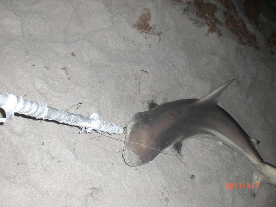 I was using a head half of a 25 lb cuda out 300 yards on my Penn 16/0 with 130 lb Gator Glass rod .The surf was choppy on this night but I had a feeling anything could happen on nights like this with big sharks being caught left and right . I had just caught another dammed blacktip but I was ok with that they were not destroying all our baits like they were a month ago .Right around 12:30 one hour after high tide my 16/0 clicker starts going off so I run over and pick it up.I knew when I felt the surge of this beast that this was no ordinary shark or another blacktip.The line flew off the reel and could feel solid fast shark as it was swam off with my big bait--no dropping or or hesitating of this bait just a steady and rather fast hit was what i felt.When i did the running man I felt the weight of an unseen MONSTER that as the mono fully stretched and the beast felt the hooks the 16/0 started SCREAMING as line began to disappear I let out a loud yell "i got em it's huge and taking heavy drag"I called out for my harness and the gallon of water as the line flew of the big Senator.