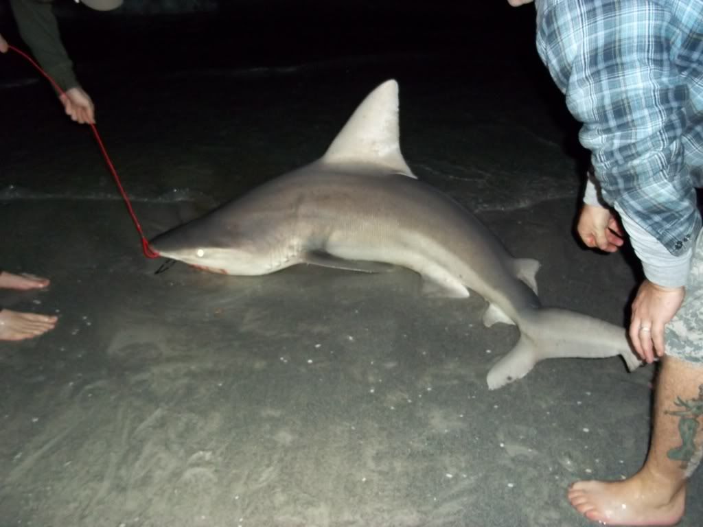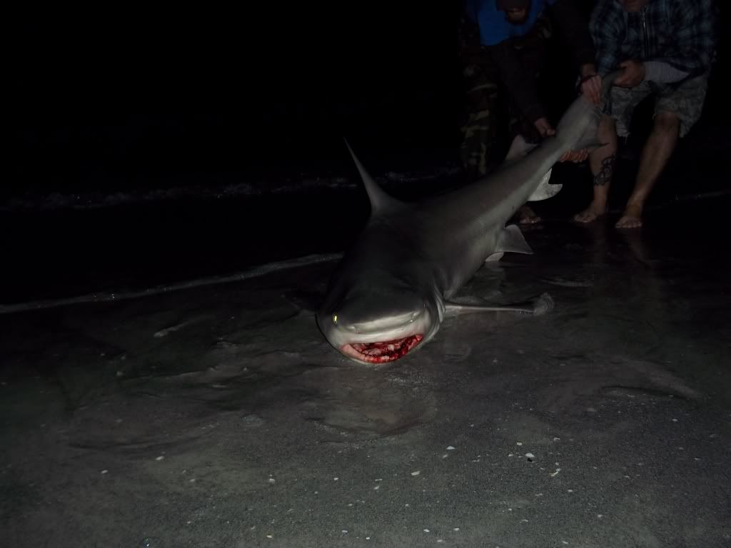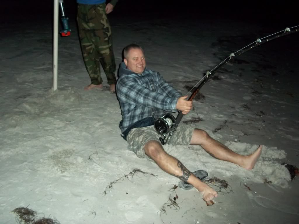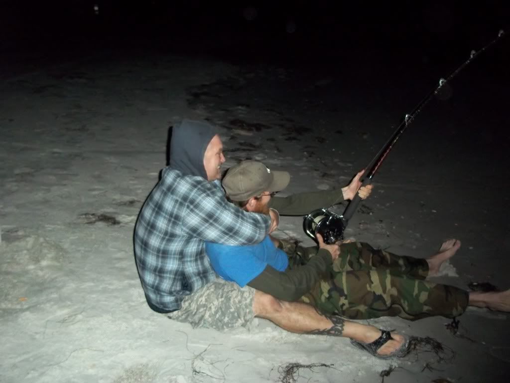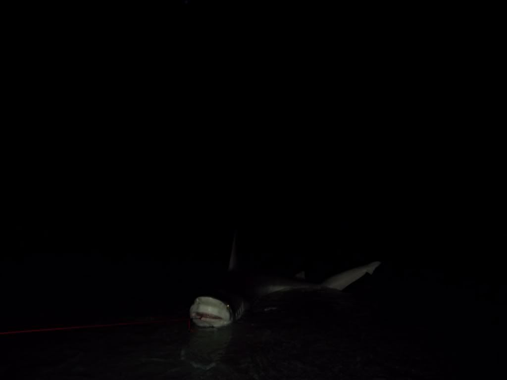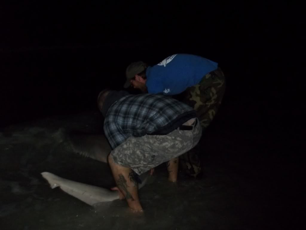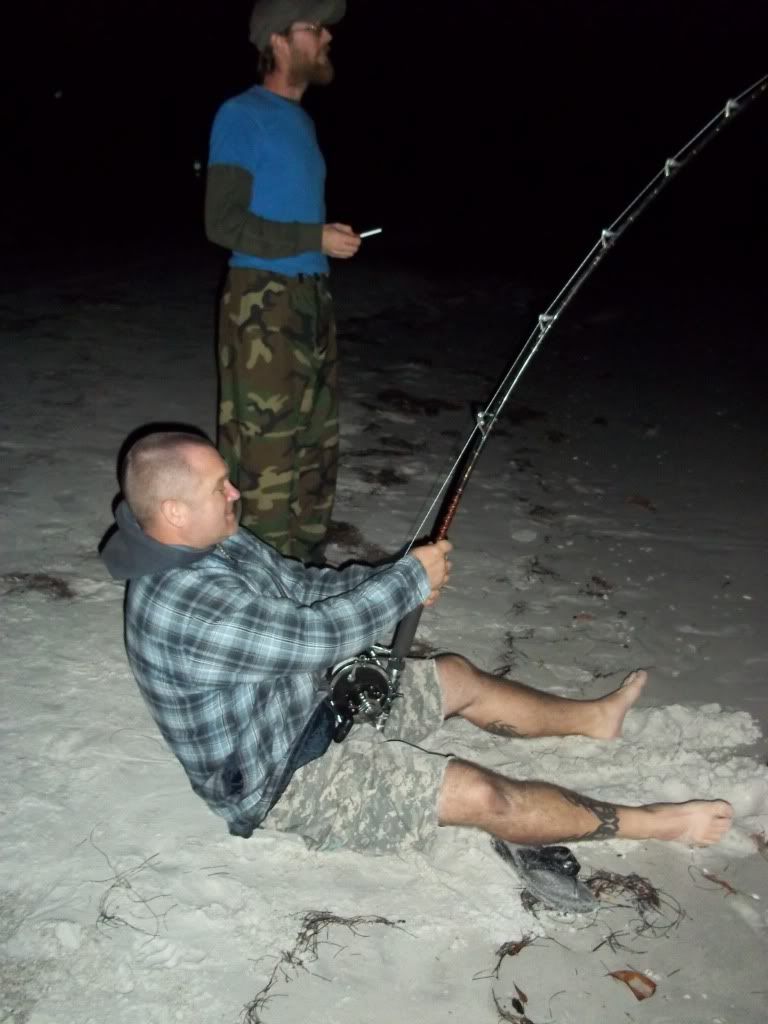 We rolled out there a little after sundown. Met up with Steve who was really just sitting there waiting lol. I paddled out our three big mullet. The first rod to be hit was Melissa's Trinadad. She gets a screaming run and meets a crab trap. Bummed, we all sit back down. Then my 12/0 starts a slow run toward Mexico. So I stick it and take my seat