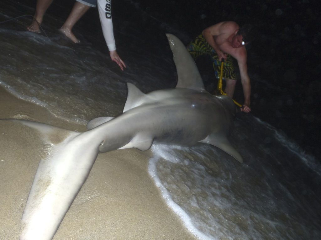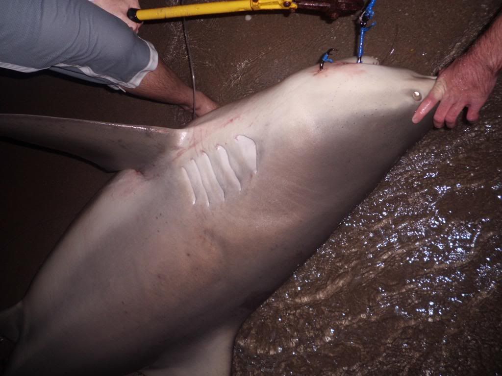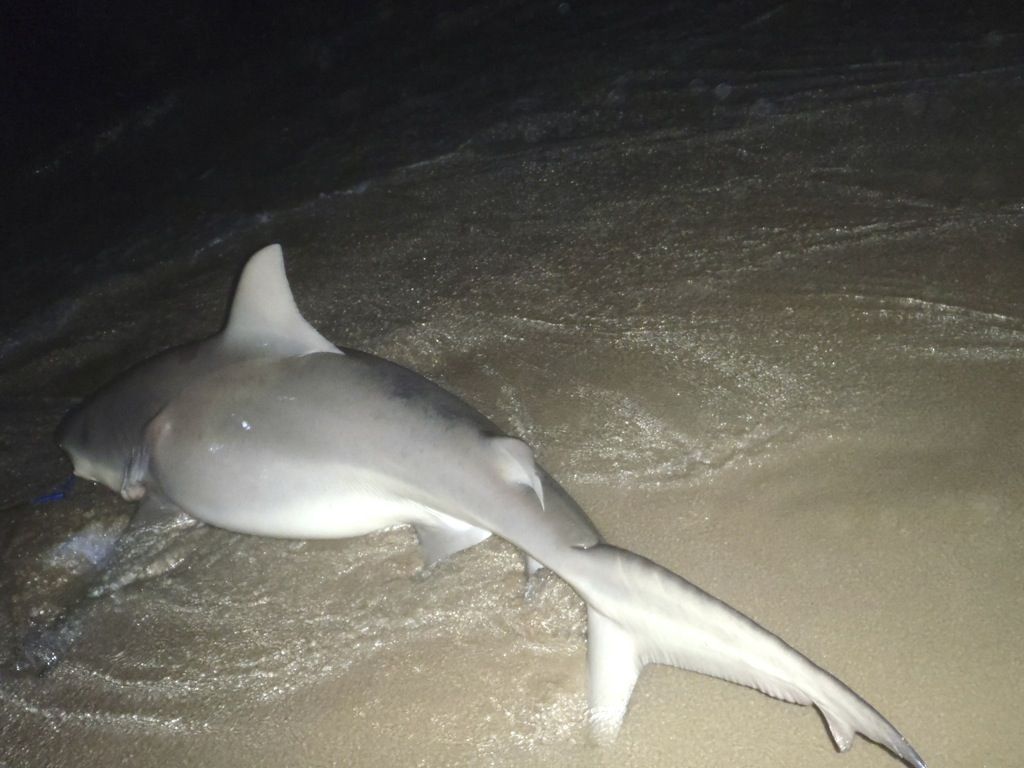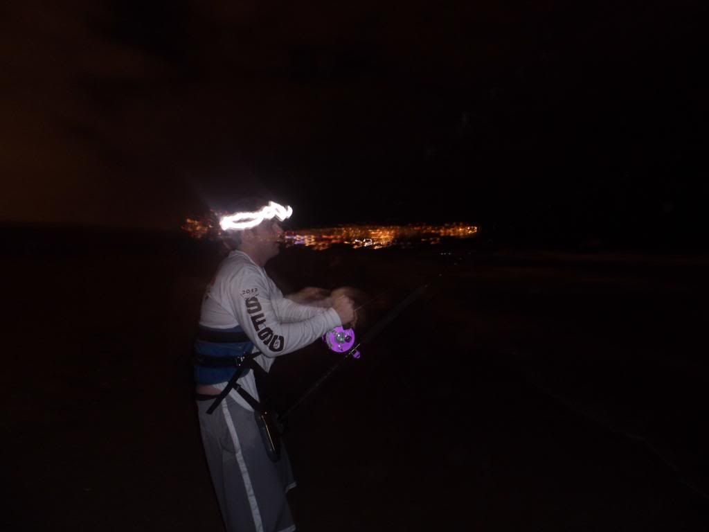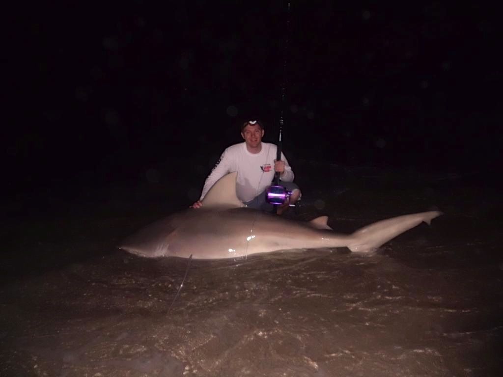Met up with JD, Hammer, and Mark for my last trip before heading back to the West Coast for school. We fished for most of the day. Mark got a fresh cuda earlier in the day. The seas died down a bit and JD got the baits out and the wait started. It was a couple hours and then the jack schools came through. We got 3 nice baits for a future trip. I hadn't eaten all day and decided to sleep to forget about that. The second I laid down, my rod with the cownose JD gave me started off. Let her eat and set the circle. Thought I may have missed when it caught and Mark had to stop me from eating s%^t. Came in pretty easy until the surf when we saw a big bull dorsal. Mark took some nice pics with the double ninja cameras. Taped out at 8'5". JD got through the cable and pulled the hook through and got her back in the water to swim another day.