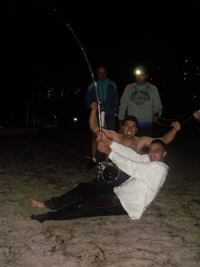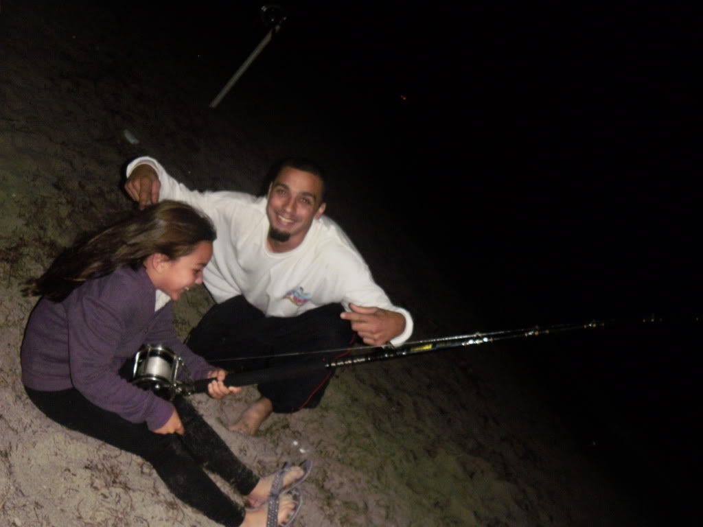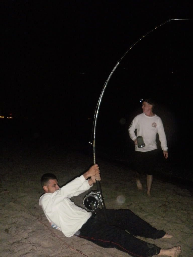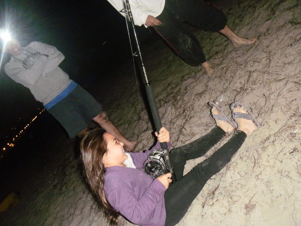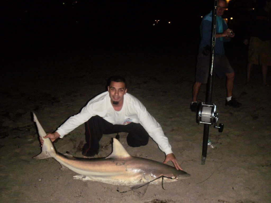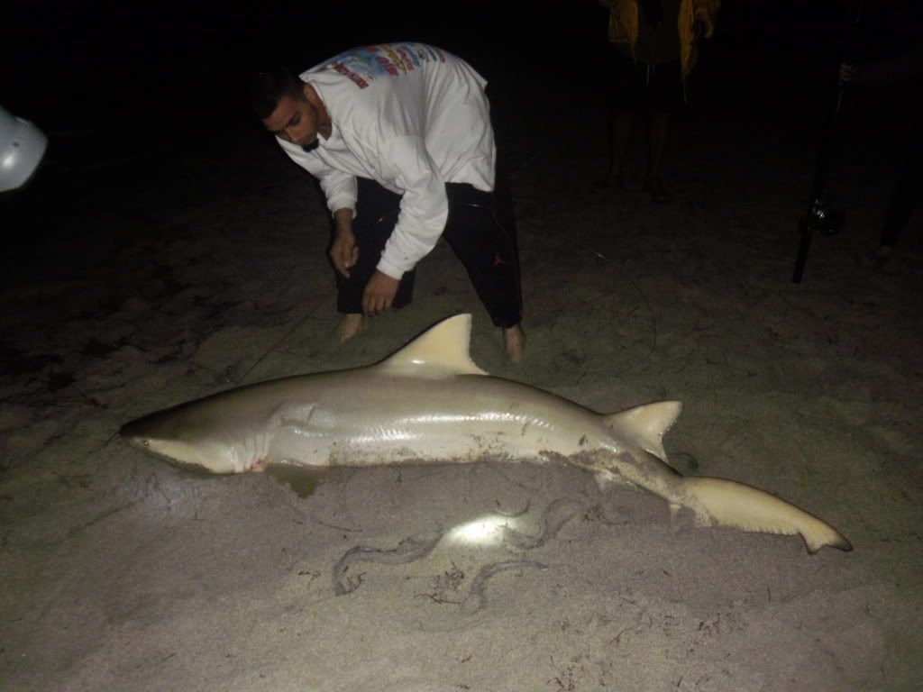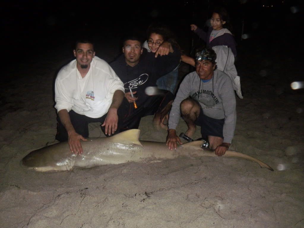 went back to see if we can hit some more shark action but this time we invited seawolf and big baits.. as soon as i get there seawolf "tony" takes his 1st rod out then joe takes his 3 then i take my 2 i get the first hit of the night but didnt even get to grab the rod cause it droped the bait then i get another hit on my tld 50wide so i set the hook and its pulling line then the line pops so my bad luck is still on.. 20 mins later joe gets his first hit we taught he had a monster cause his rod was bending like crazy but it wasnt taking drag he pulls it in and it another blacktip then his 9/0 gets hit he sets the hook and screams at mimi his girlfriend niece "8 years old" so now she is fighting the shark for like 2 mins till she gets tired then his girlfriends daughter get the rod she fights it for like 6 mins till she was tired then joe finished the job and it was a 7 ft 2 inch lemon