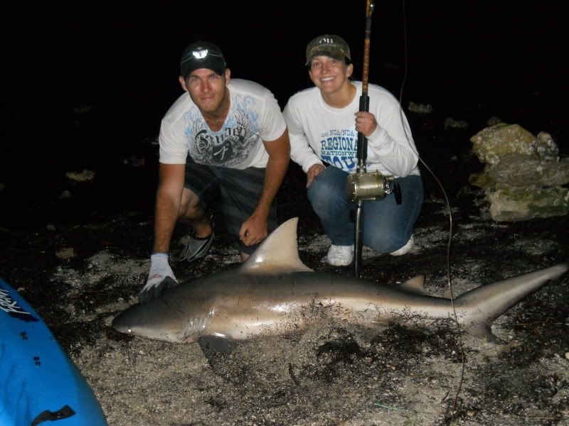 lots of bulls heading into the inlets to roam the Indian River Lagoon. me and adam (tightlinez) went out friday afternoon to get some rays to use for bait. dropped out 3 baits later at night, had a pick up on one rod, and when i set the hook, nobody was home. not much later the line on adam's avet slacks up. he cranks up the line, and sets the hook. thinking it was a jewfish because it didn't put up much of a fight, he hands the rod to a friend we brought out. she fights it, and as it's coming to shore we realize it's a little bull. land it, dehook it, get the pic and send it back on it's way.