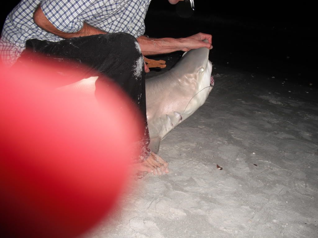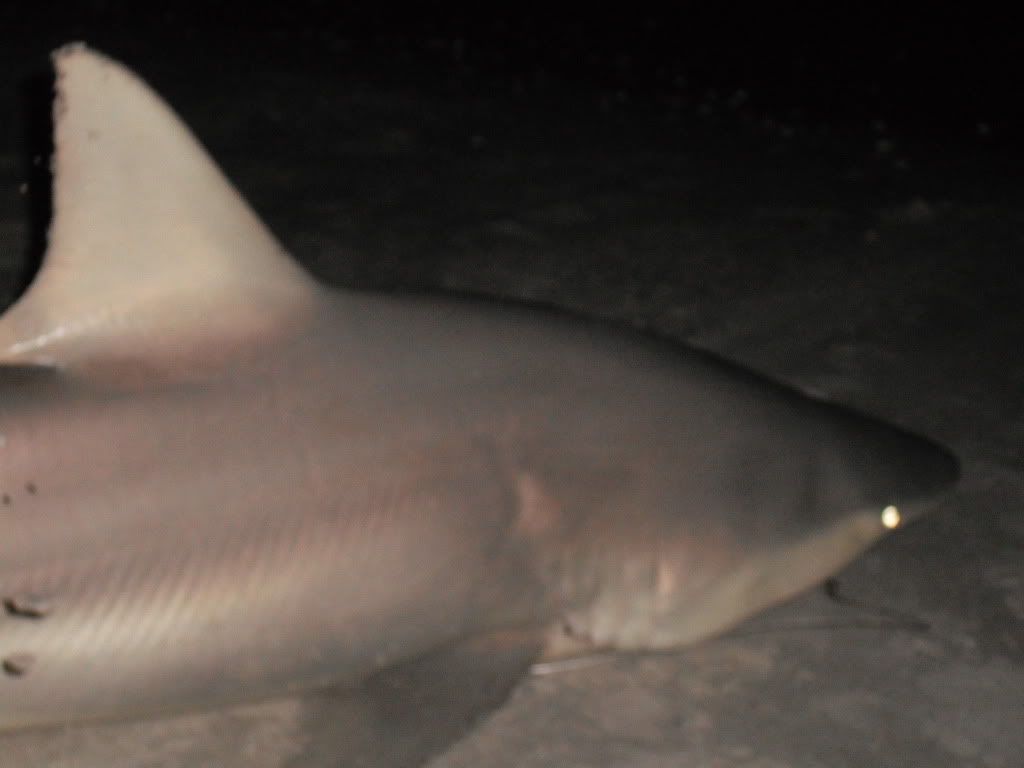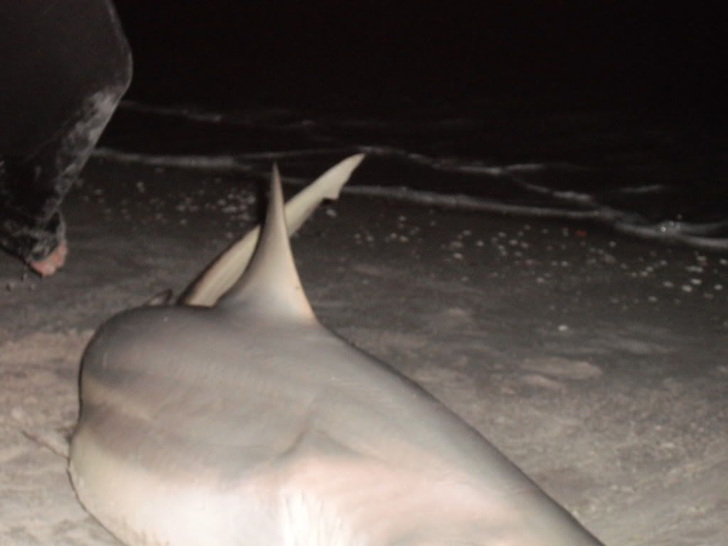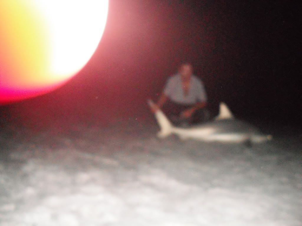 Today was a challenge just to find a place to fish, searched for about an hour to find somewhere. I was hoping to find some open space and catch some fresh bait and put it out there before sundown. Finally I found a place and the few people that were around looked like they were about done cooking in the sun all day and ready to leave soon so I started to fish for bait and wasn't having much luck. I could see fish and birds and tried several different things/bait but it wasn't working. About an hour later my brother came down and he caught a few small ladyfish so it looked like we were in trouble. Then came a stream of mullet right inbetween the shore and 1st sandbar..I waded out with the cast net as far as I could to get em and I kept all the biggest ones I could get and released the rest. I ran a big one out about 150 yds, and 3 medium ones threaded onto 1 hook about 200 yds, and I cut a ladyfish in half and casted it out about 120 ft from the shore. I didn't have much optimism with all that mullet sittin' out there. I don't doubt it as a bait and I have caught some good snooks on mullet but my biggest shark ever on mullet was a 3 and a half ft nurse shark, until tonight. we got a good run and the glowstick fell to the ground. I let the fish eat it and my brother came runnin' over, then line stopped goin out so I reeled the slack I figured the fish just turned in and still had the bait..I was right, he headed back out again so I set the hook and he took off some line. I passed the rod to my brother and let him fight this one, then I went and got my tackle box and set it down by the glowstick so we'd be ready. It was a decent size blacktip about 6' and nice and thick. about an hour later my brother had to leave but the casted rod kept getting runs like crazy, while the bait 200 yds out I began to wonder if it still was on my hook. then I had a hookup on the casted rig and it felt like a decent fish..but I was fishing with straight 250# mono as leader and it lasted a couple minutes then I got bitten off..must have hooked the fish too deep. Later on after the casted rig stopped getting runs like crazy I brought em in and called it a night.