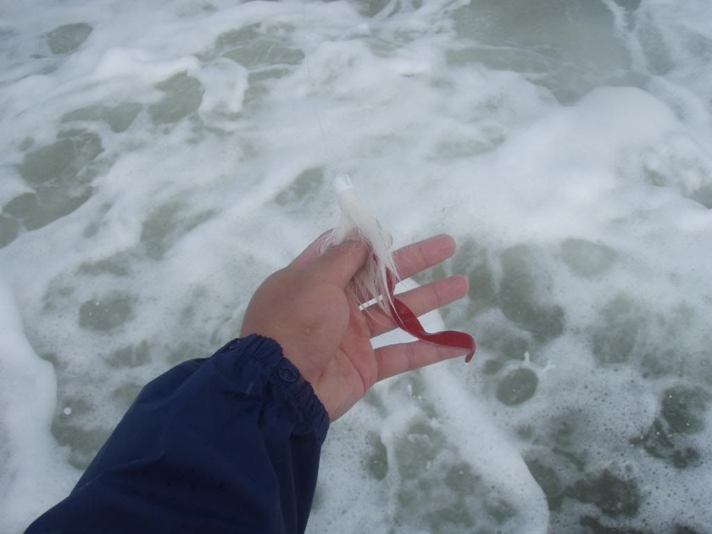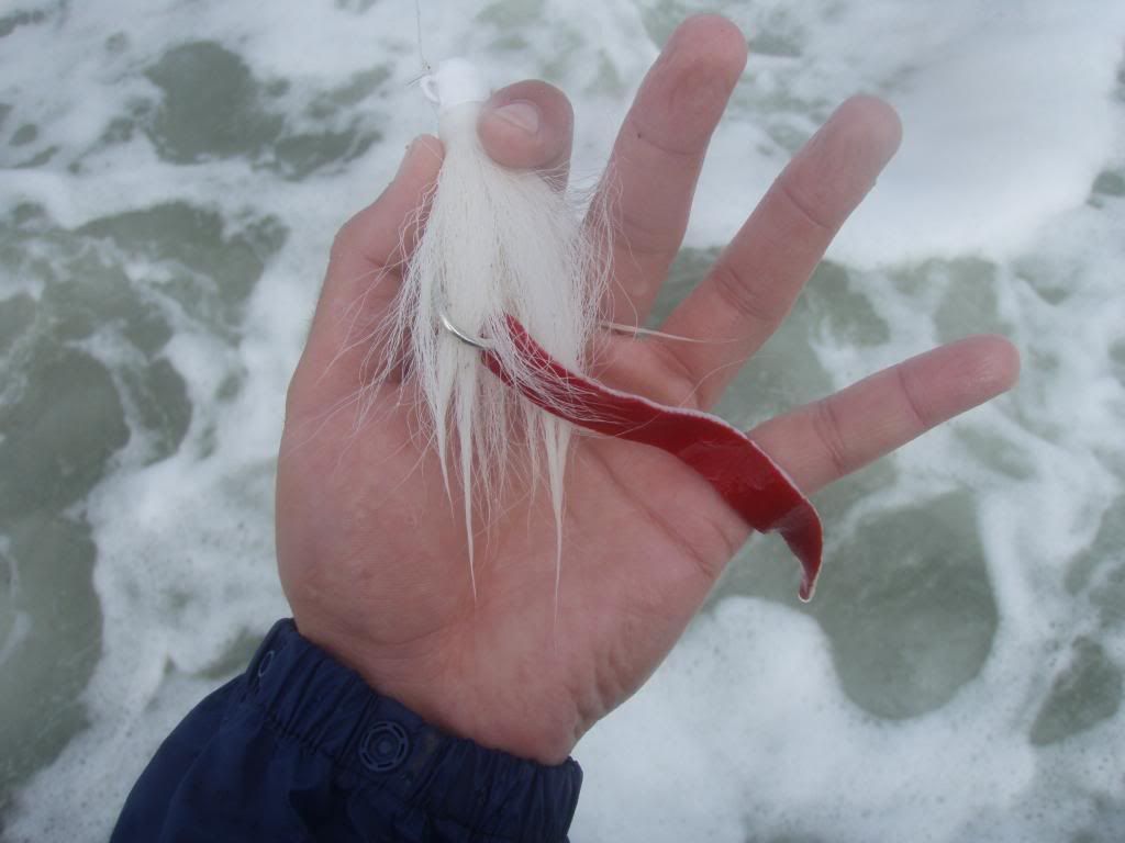 We got up early the next morning to steady rain and wind. Suited up and headed back to the rocks and plug our way up and down. Nothing happening. Switched up lures and started throwing white bucktails with red pork rind.