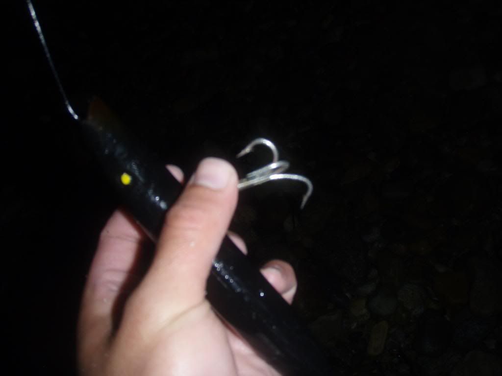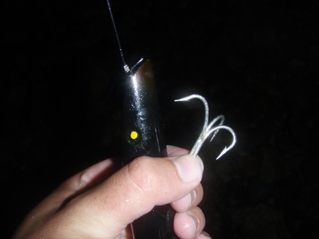 Shortly after i hooked into a fish that hit real hard but only gave me a few head shakes to start so i thought hey its nothing special, but as soon as the fish turned oh man it took off zzzzzzzzzzzzzzzzzzzzzzzz. And then shook the hook. I started to question if my drag was set right but i knew it was since i just landed that bass before it. I got curious and a few casts later looked at my darter and found that the big girl completely bent out my treble. Two of the points were brought together and one was bent out kind of like an L.