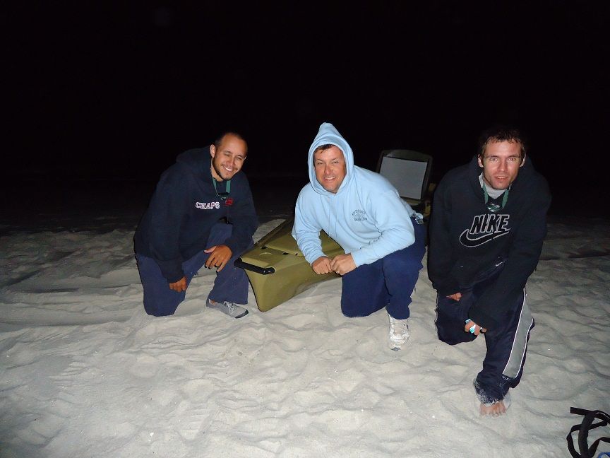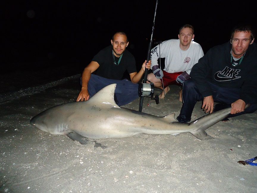 Doug ,Chris and John pose with a solid 6 1/2 foot male bull shark the only prize on this night