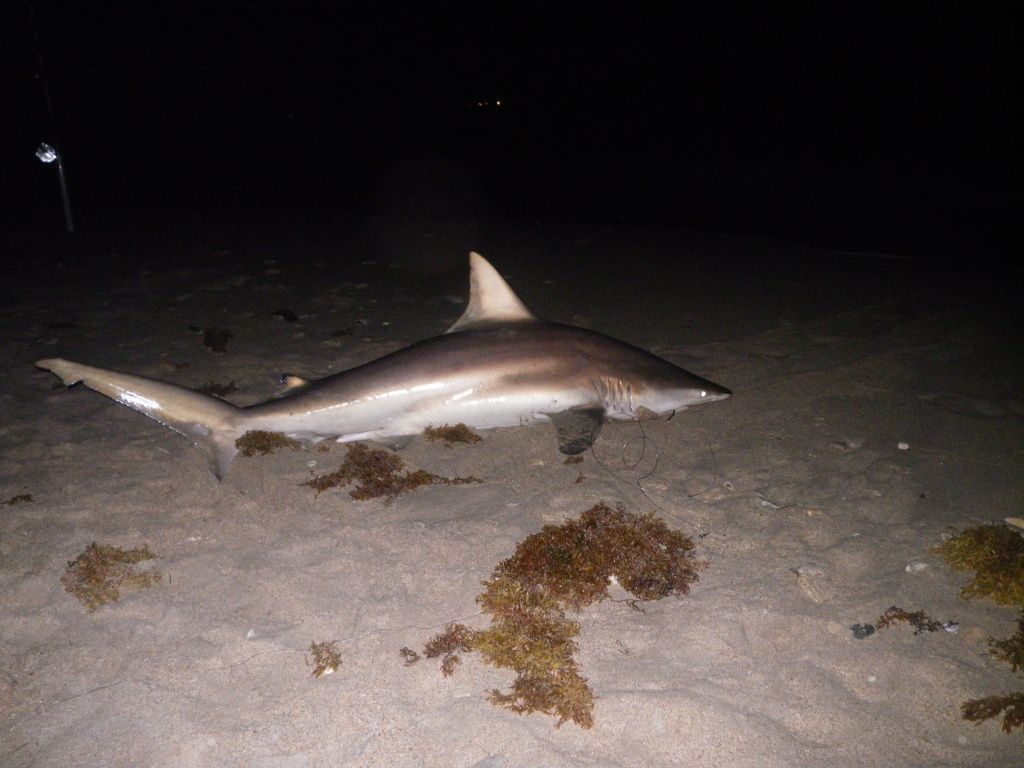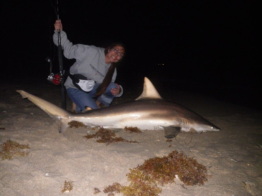 Went sharkin off the beach with my girlfriend last night. We brought a nice bonito for bait. I put out a big mid section on my 12/0 and a smaller piece on her 6/0. We wait for about an hour and the 6/0 goes off, my g/f pickes it up but the shark lets go before she could lock up the reel. About an hour later it goes off again but this time we know it has the hook. She lockes down the reel and its on! We didnt know what she had at first because this fish was doin a nice run and pulling quite a bit of drag. She is a few minutes into the fight and my 12/0 starts goin off. At this point i dont know what to do because im trying to help her but i want to get the big gun. It runs again and i should have set the hook but i kept the light on her and the 12/0 stopped going off. The entire fight we had a cop watching us and he ended up taking pictures of our shark when we landed it. He said he does the same thing from time to time. It ended up being a male blacktip with a 70" total length and a girth of 31 1/2". Her biggest shark to date.