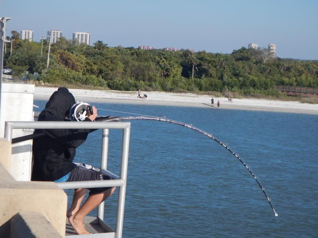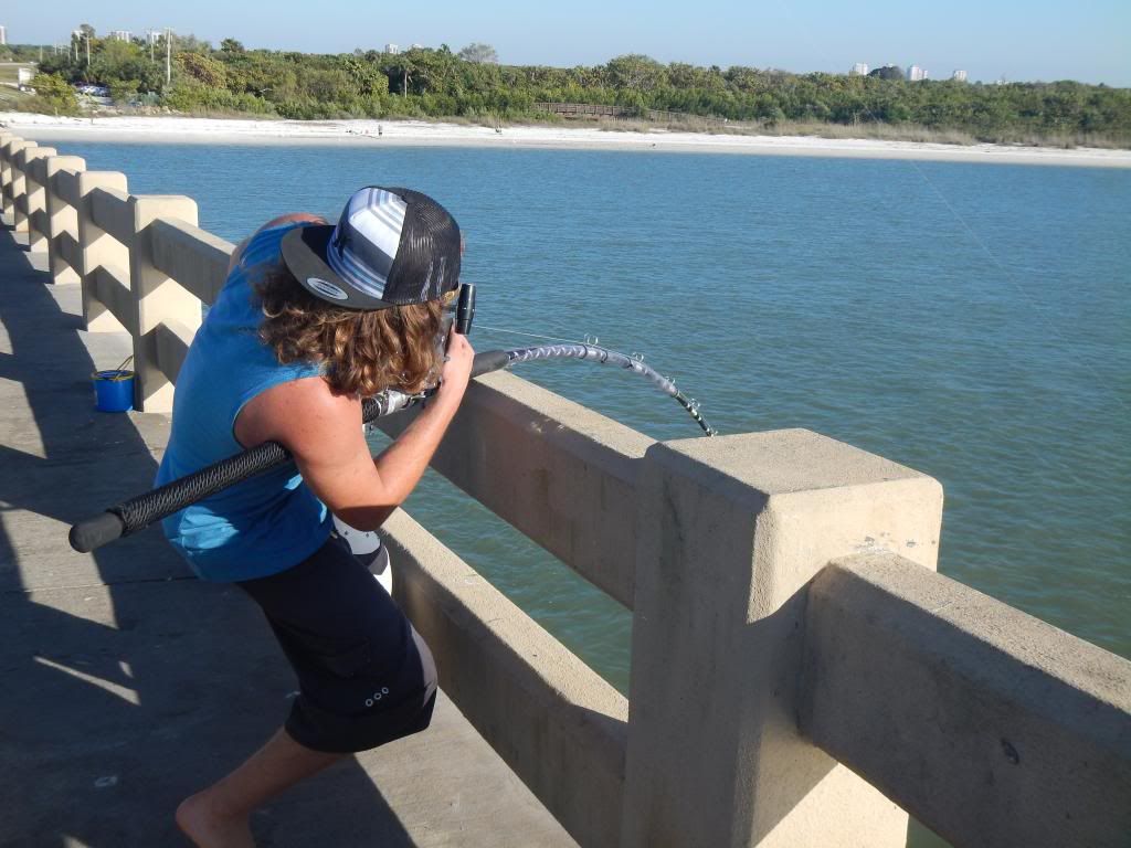 went up to big carlos for a little bit to see what was out there. dropped a blue crab down and worked a lure and put a cut bait on bottom. the water was really murky and dirty. eventually a huge catfish ate the cut bait so I cut its fins off and put him on the 14/0 live. 10 minutes later a the catfish got picked up on top of the water with a huge swirl and the 14/0 started screaming. I set the hook and fight the sandy to the beach.