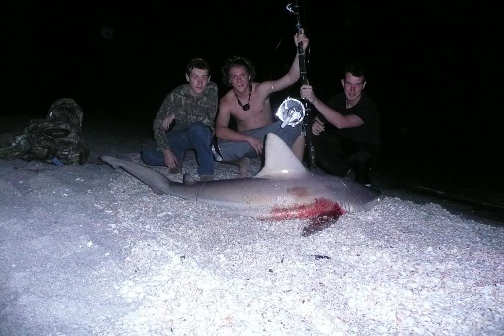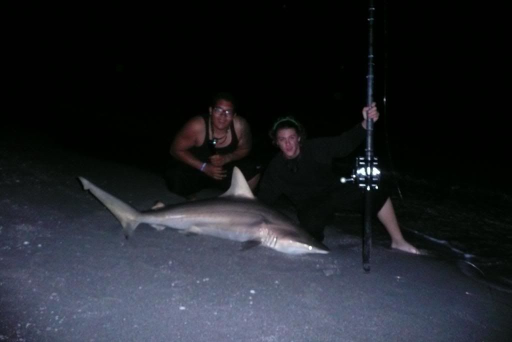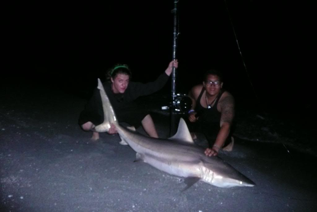 night started by me jetting home from work gather my shark fishing gear. getting picked up and racing to the beach. i set up the 14/0 for me and the 6/0 for my buddy. the water was flat all night. about an hour later the 14/0 goes off, i set up fiht the shark for a little bit and bring her in. a nice looking sandbar shark.