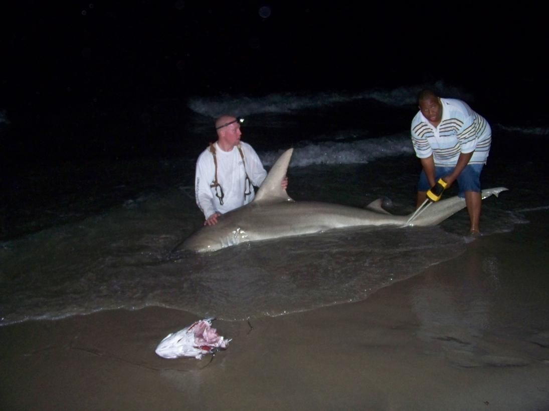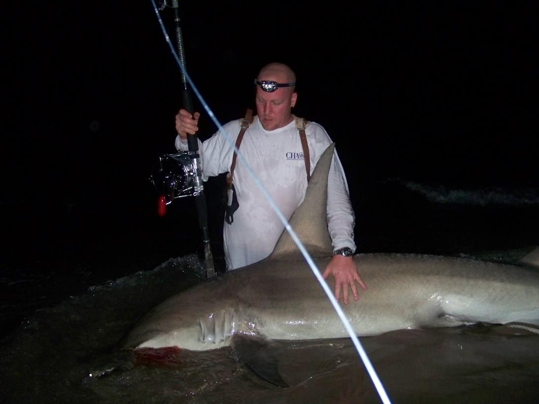 Went up to west palm to soak a few baits but had a little mishap with my kayak it was sinking, so I only got one bait out .Choice bait half a 30 lb amberjack on the 16/0. About 2 hours later that oh so great alarm we all love to hear !!! and it was on for about 30 min then a 10'1" hammer saw the beach.Hooks were removed tag was applied and he swan off strong too grow 5 feet longer and then il'l catch him again..