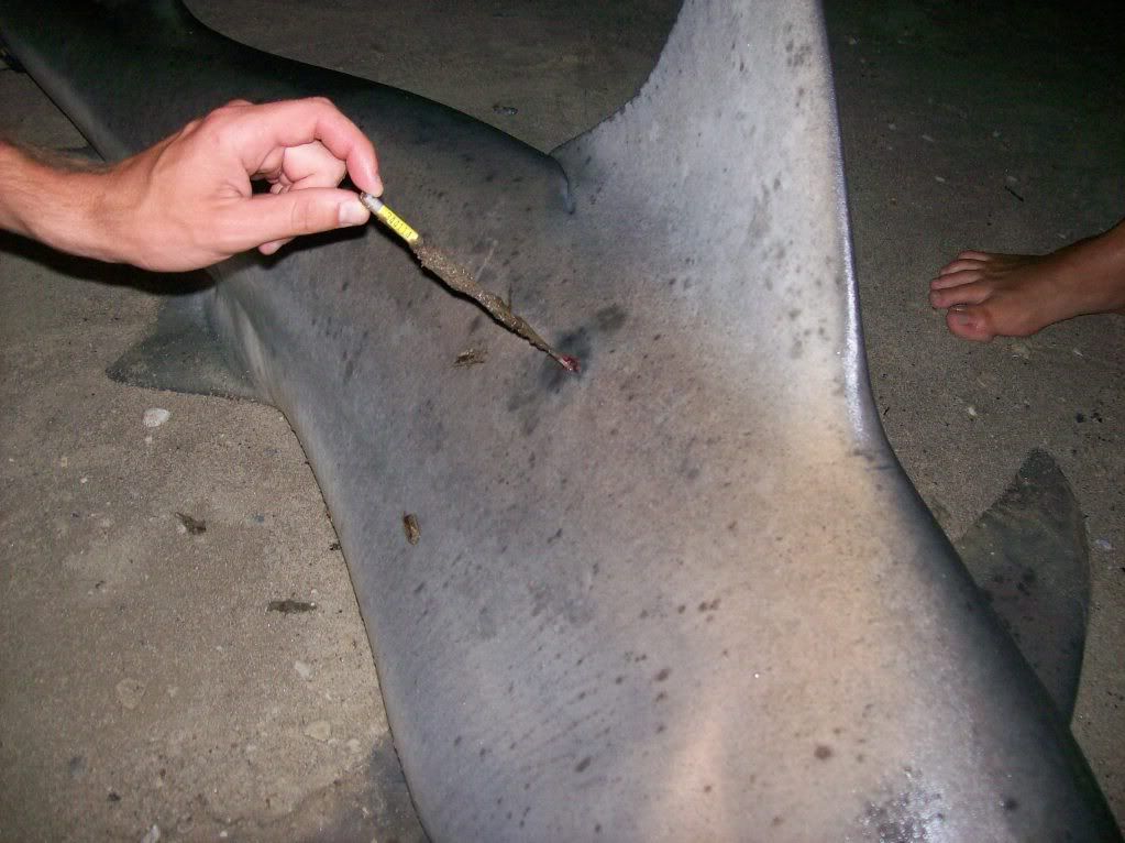 About 10 o’clock or so, Bill has a strong run and finally beaches another Bull that was pushing 7 foot. Again more pictures were taken. We noticed what we thought was a growth on it’s back. It looked like some kind of worm. Bill grabbed it and was going to pull it off and saw it was actually a tag with the numbers. As of today we haven’t be able to find out any information but are eagerly waiting to see where this shark was originally caught and tagged. So another first, a tagged shark.