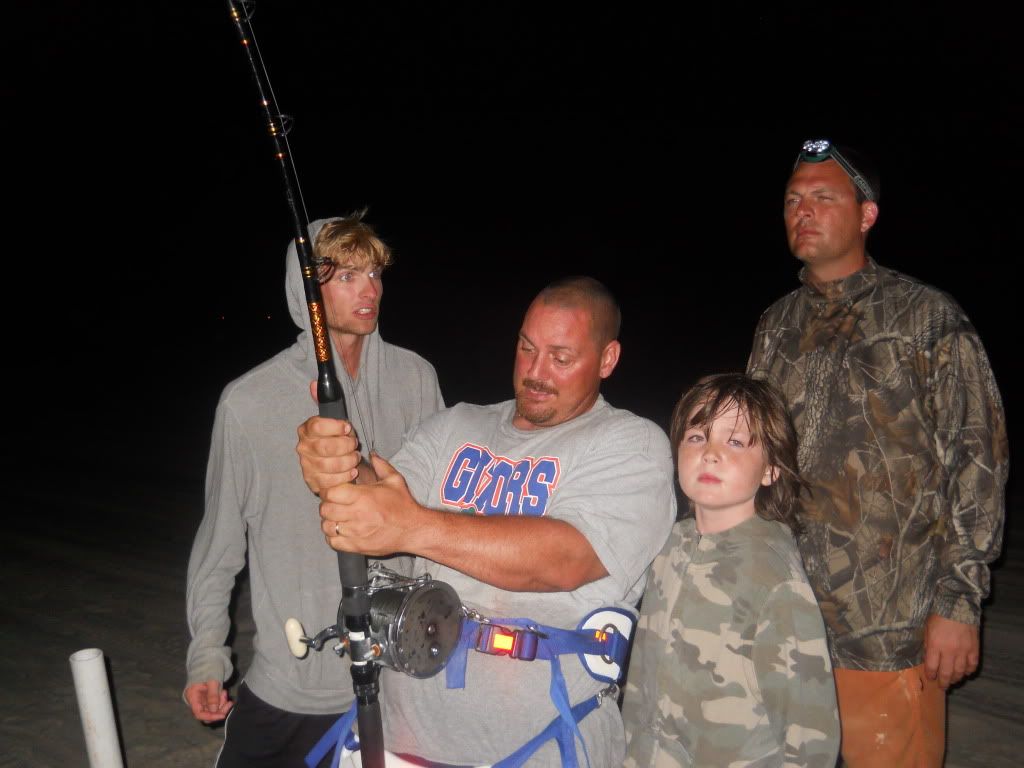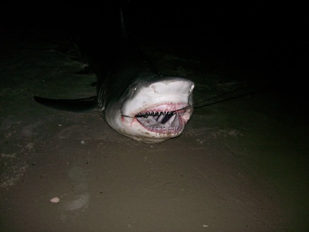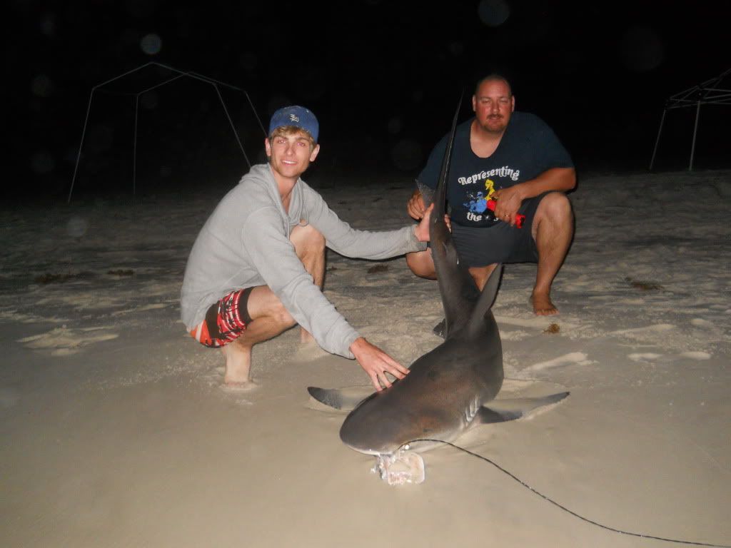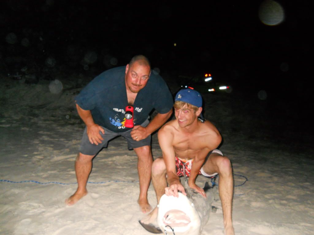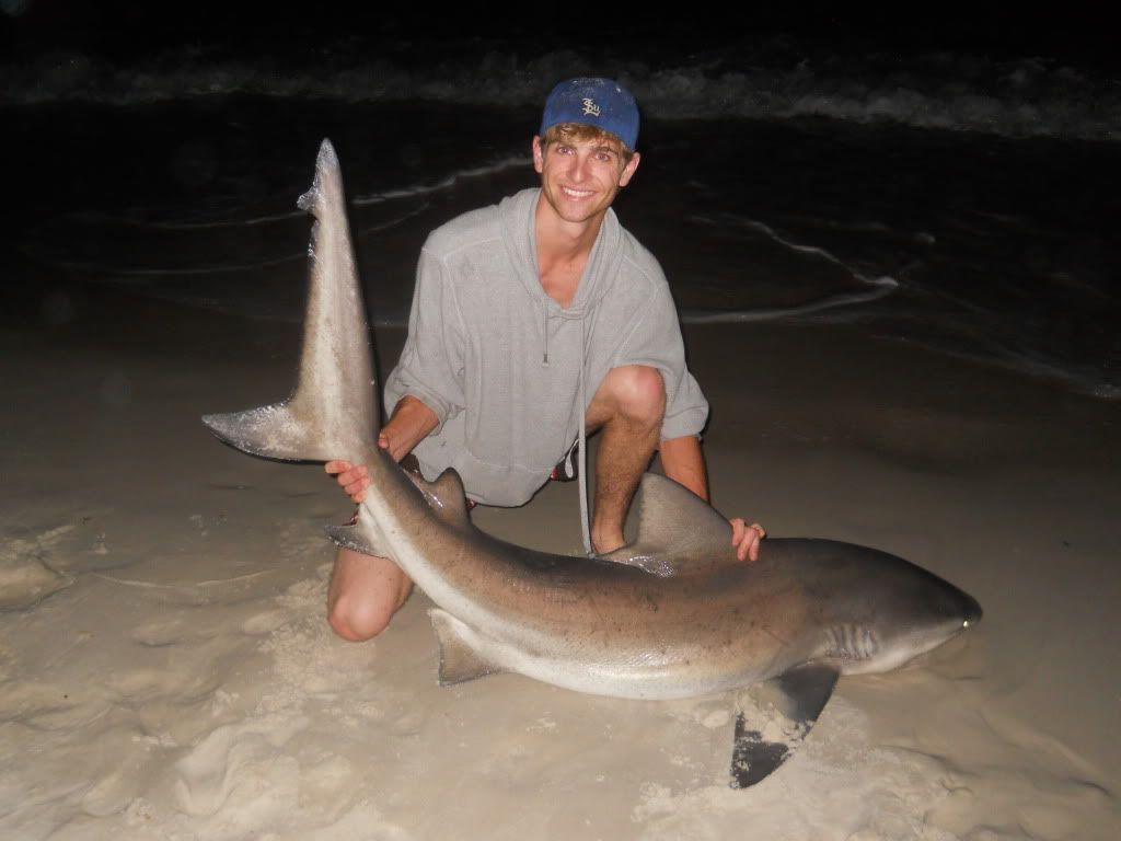 ‘’At 11 o’clock on Saturday night, just as I laid down next to my dad in the tent cot, his 12/0 started clicking off. For about 30 yards the shark took line. As soon as I could strap my belt on, it he spit the bait. 3 minutes later the same identical thing happened. As soon as I was in the fighting harness he spit the bait. After another 5 minutes the same thing. By that point I decided I was just going to keep my harness on and wait for him. I stood there for about 45seconds (yeh, a lil bit inpatient but I needed to set the trace again). Finally, after another minute or so he decided he was too hungry to mess around and the fight was on. All in all the shark and I were in a battle for about 45 minutes before he hit the sand. When he finally got there it was an 8 foot lemon shark. Not only did I catch my personal best that night, but I also caught a new species, for me anyways’’