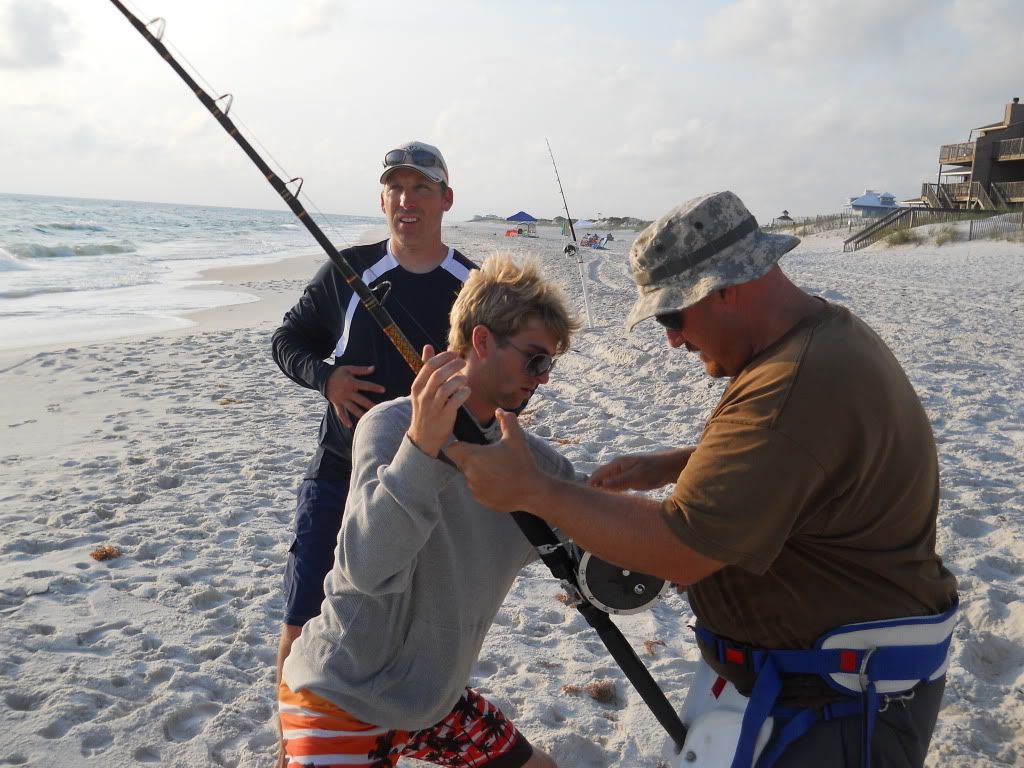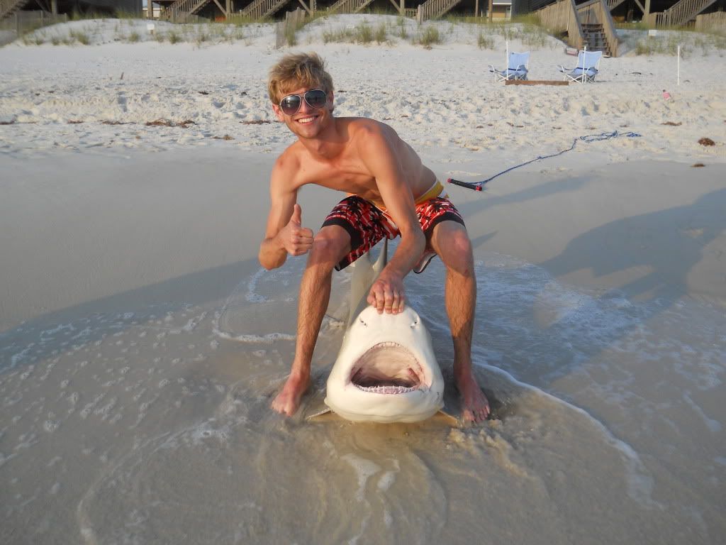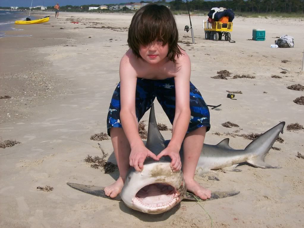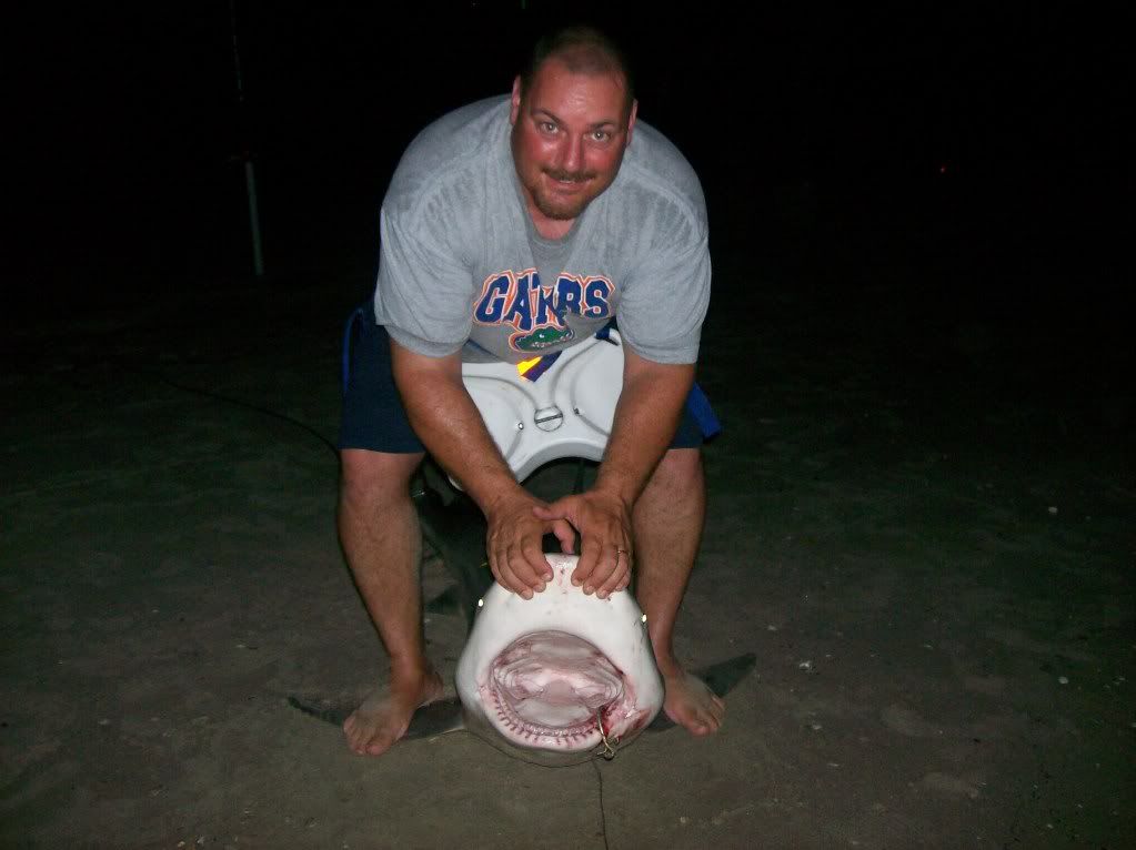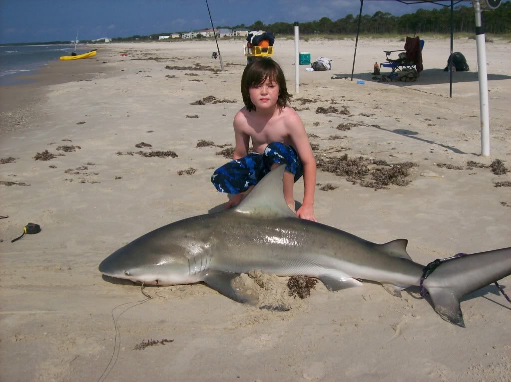 ‘’At 11 o’clock on Saturday night, just as I laid down next to my dad in the tent cot, his 12/0 started clicking off. For about 30 yards the shark took line. As soon as I could strap my belt on, it he spit the bait. 3 minutes later the same identical thing happened. As soon as I was in the fighting harness he spit the bait. After another 5 minutes the same thing. By that point I decided I was just going to keep my harness on and wait for him. I stood there for about 45seconds (yeh, a lil bit inpatient but I needed to set the trace again). Finally, after another minute or so he decided he was too hungry to mess around and the fight was on. All in all the shark and I were in a battle for about 45 minutes before he hit the sand. When he finally got there it was an 8 foot lemon shark. Not only did I catch my personal best that night, but I also caught a new species, for me anyways’’
