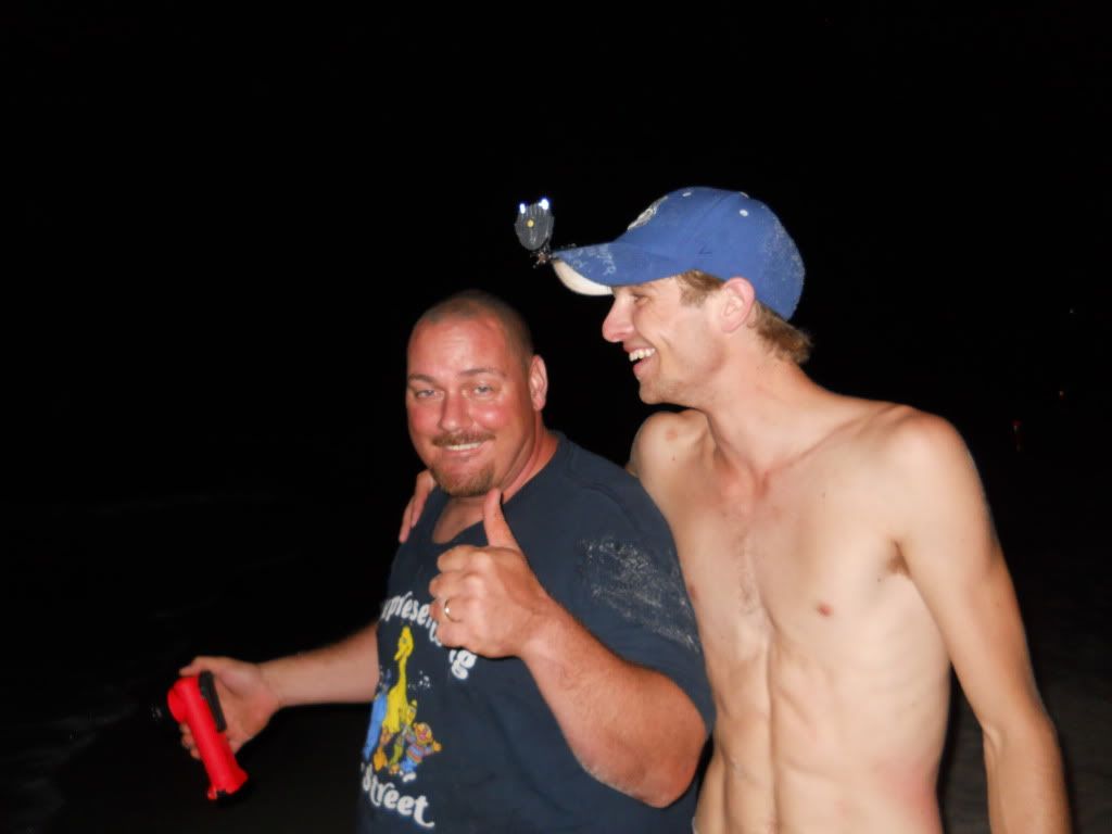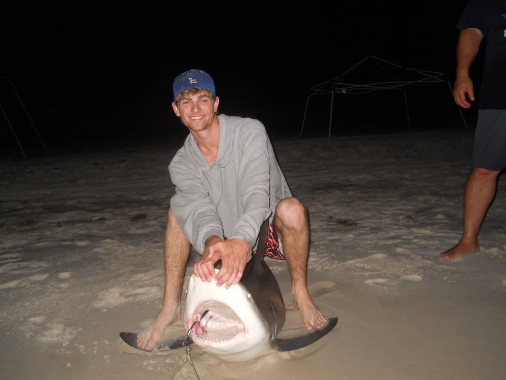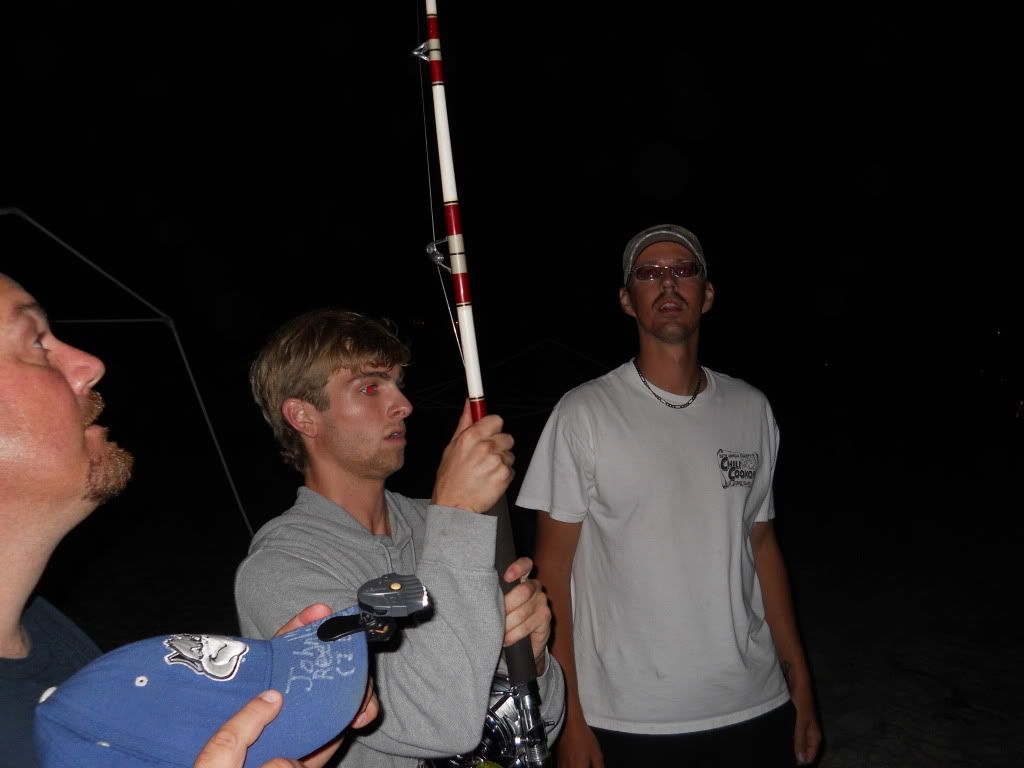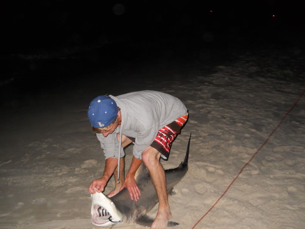 Because of the trip and the late hour we all decided to hit the tent cots. This night turned out to have very little sleep because of the constant runs we had throughout the night. About 12:30 the lucky 12 goes off and everybody is scrambling to get out of their tent cots. I don’t know how to describe when you are dead tired and passed out and then within minutes your body is just pumping adrelin-- it’s a crazy feeling. Hunter does the honors and pulls in a 5’11” black tip. hooking and taking some pictures we sent this fat little toad back to the depths of the dark ocean. Because we were so pumped up it took us a little while to settle down, then we all got back into our tent cots.