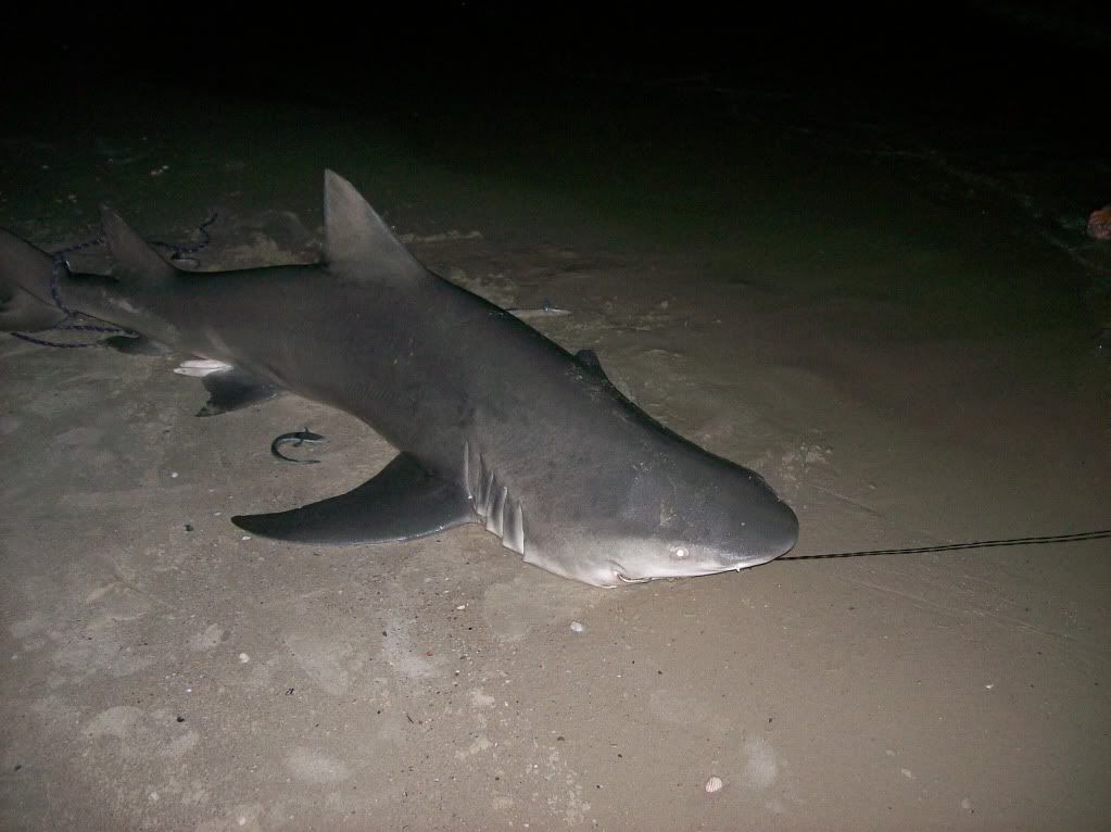 That day we didn’t have any action until right before dark. Bill hooked up with a 7’ 11’’ Lemon, that was a handful for Bill to beach. It took three of us to pull the shark up on the beach far enough to get the hook out. Bill was so excited and had mentioned earlier that he needed a new species of shark and now it was in front of him lying on the sand.