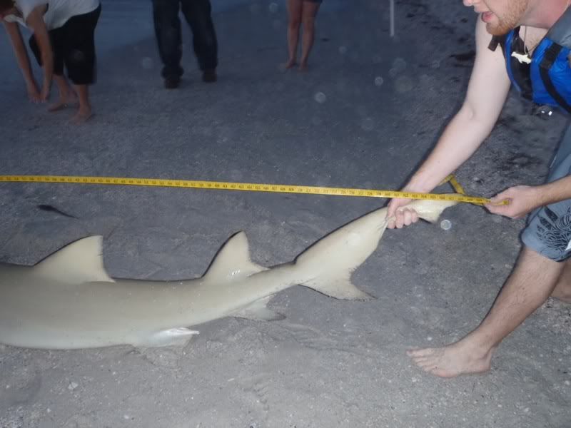 Set out the rays and aj head around 530. Saw the middle rod had gone slack and assumed the rock line snapped. Reeled all the way in on the 80w when the line starting cutting left and right in the surf. Finally a fin showed up in the breaker, got him on the beach, and was greeted with a lady screaming at us to release the shark, we were anyway of course. Only thing I dislike about fishing during the day. Got a picture and measurement, 7'4" Lemon, and sent him off on his way. Lady continued to scream at us and later in the night, we had a visit from the local police