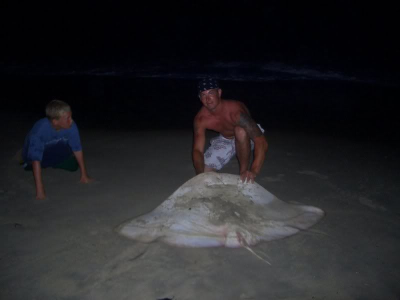 The night went on and the constant action kept us all busy, just when it seemed like the bite would slow and we would actually sit down for a second. I tell you what I have seen some funny stuff happen on the beach but Zane you really had me LMAO. Zane is a catfish man with rod and reel set up for just that. Zane decided he was going to throw on a chunk of sting ray on his smaller spinning set up with 65lb braid and a short mono fish finder rig. This rod was about 30 feet from where we where sitting when all of the sudden we looked over to hear his rod screaming and folded to the sand. Zan made the mad dash for the rod only to pick it out of the rod holder to see about 10 wraps of his mono backing under the braid, LOL he took off running toward the surf and because he was freaking out he tip wrapped the line around the guide, the rod bent and pop!!! it broke off, well got bite off. Lucky he had mono for a bite leader because he would have been swimming with his rod or buying a new one that took the trip to Davy Jones. Zane you are the man!!!! that was freaking awesome to watch, I am sure if it happen to me I would not be laughing, I am sure glade you thought it was as funny as I did.