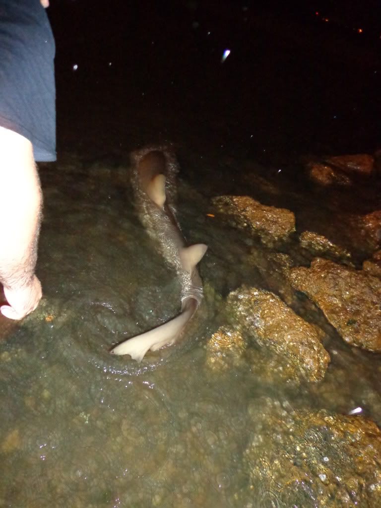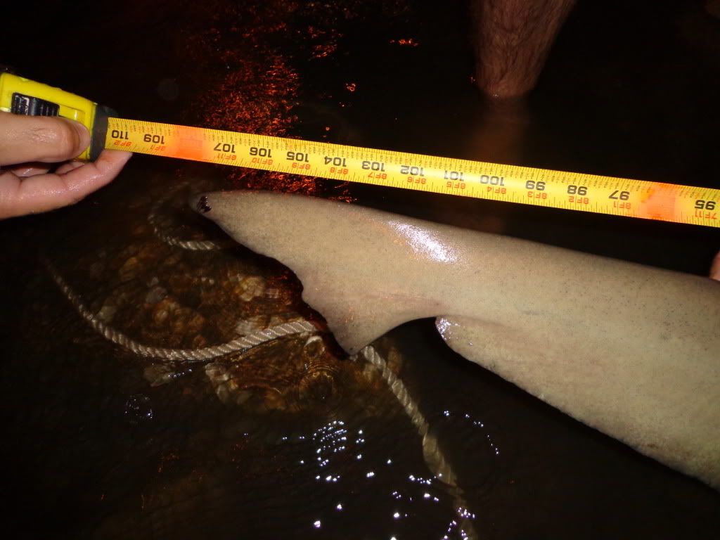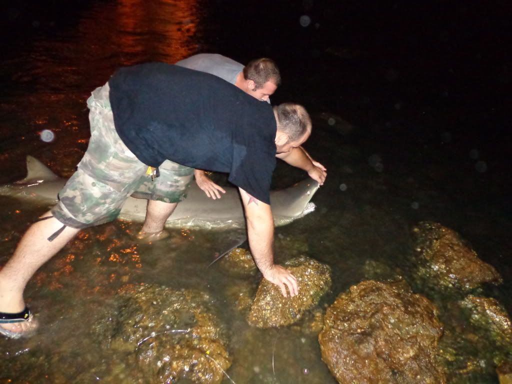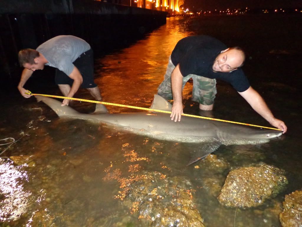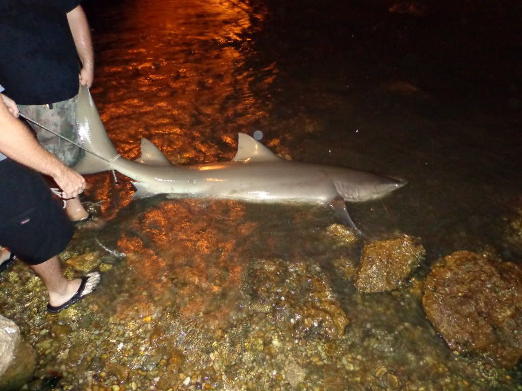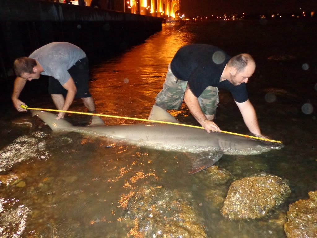 it started off slow and it was pretty windy,wallace had his bait out for about an hour with no luck,we were working on catching some fresh bait then some crazy ass storm decided to come through bring some 30mph winds ans sideways rain for about 45 min then it let up to a light drizzle ans i went back to getting bait. i managed a nice size lady fish cut him in half and sent him out, About 10 min later my 50w goes off i let him eat and then lay into him, after a solid 75/100 yard run i knew it was a good fish....about 15 min later this is what we landed
