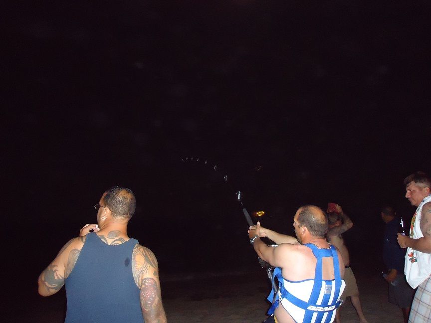 Went fishing wed night with Will and the rest of our team to get some pre BHC fishing and met up with team Knot Shore from Hollywood. Beautiful night, calm seas and fresh bait. Our team had seven lines in the water at various distances. Anywhere from i think 125yds to the deep drop about 250yds. The three short drops were getting picked up by either nurses and small pups and none commited. Then around 9:00 my 14/0 which was the deep drop gets slammed!!! I put it freespool and let him eat and then i lock it down and start the running man the only problem is the fish stopped me in my tracks and my rod spun around on my shoulder and the fish started pulling some serious line. This was the result
