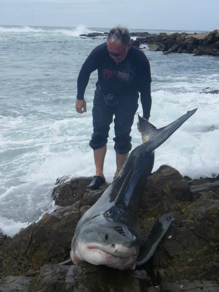 Me personally being a shark fishermen for three decades would be tempted to fish for Great White sharks if I lived in a place like Mossel Bay South Africa.Having grown up during the movie Jaws era and all the Great White craze of those times and having dreams of one day catching the baddest creature in the sea, I believe that I would target Great Whites undercover with the intention of catching ,tagging and releasing the biggest Great White possible.I would not sink gaffs into the shark such as the knuckleheads in the above article did and then watch it bleed out on top of rocks with pounding waves but I personally believe the Great White shark could be effectively caught and released if the anglers involved knew how to properly and quickly measure,dehook,photograph and tag these beautiful creatures.Properly done tag and release of Great White sharks from shore could even help scientist better understand the movements and life cycle of these magnificent fish in any given area.The difficult part would be in convincing goverments of the fishermens good intentions to only catch,tag and release the Great Whites.