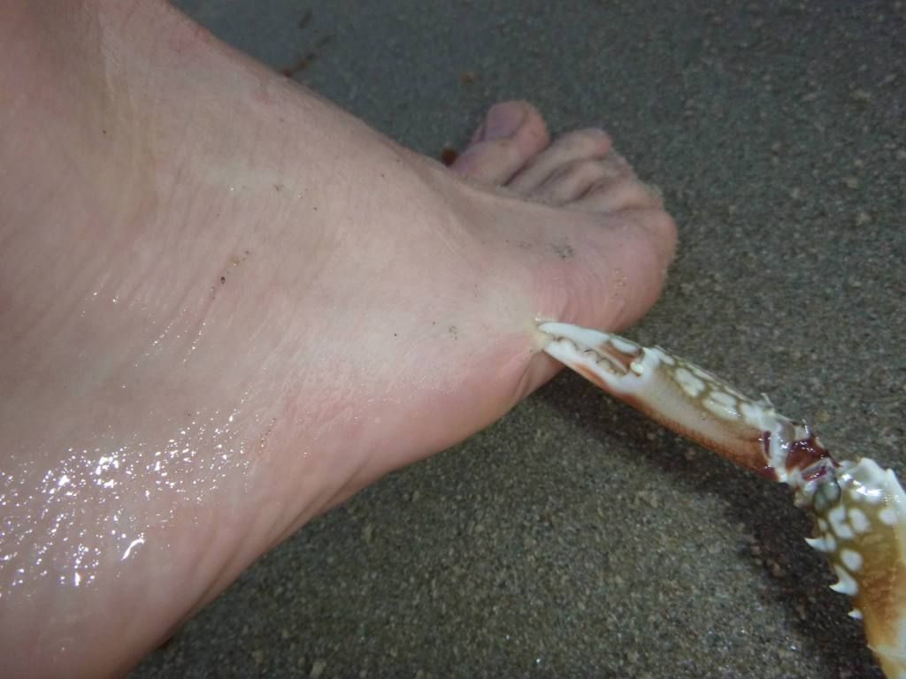 With this being the first shark of the trip we were all running around excited and at some point Scott looks down at his foot and there is a crab claw clenched to his foot haha: