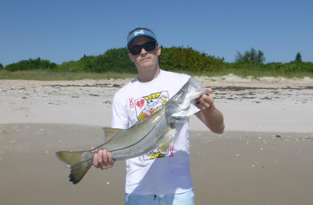 I must have missed 4-5 hookups within a half hour that night. We called it quits pretty early this night and packed up and went in. Next morning I got up bright and early and was walking the beach with some light gear and a spoon and caught my first snook ever, I was extremely excited to catch this fish and it was one hell of a fight but I had forgot my camera. There were 2 guys down on the beach surfing and one agreed to hold it in the water while I sprinted up to the room and got my camera and came back down. He snapped a pic and we let it go and it swam off strong.