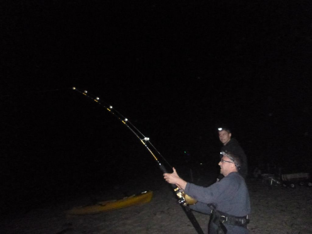 The last day of the trip for me, and we were down on the beach early. John, whose rods stayed quiet for most of the week after the first day, finally gets a good one: