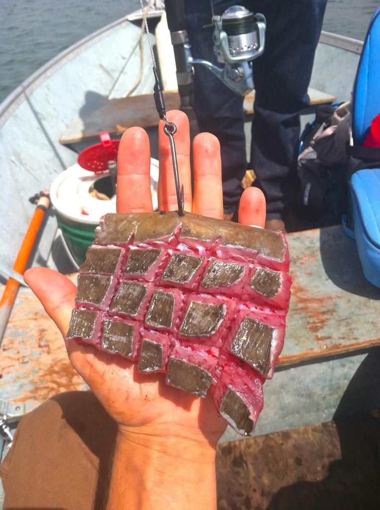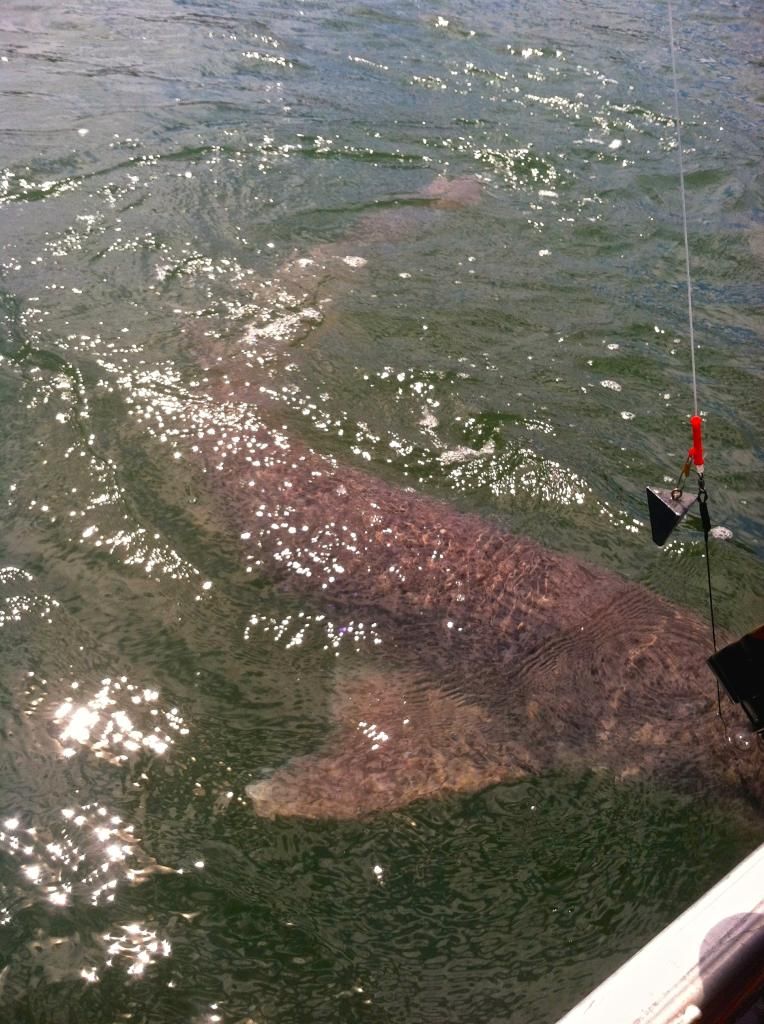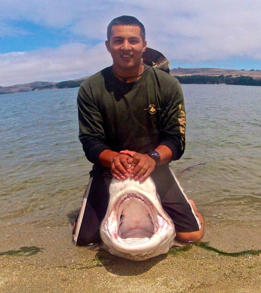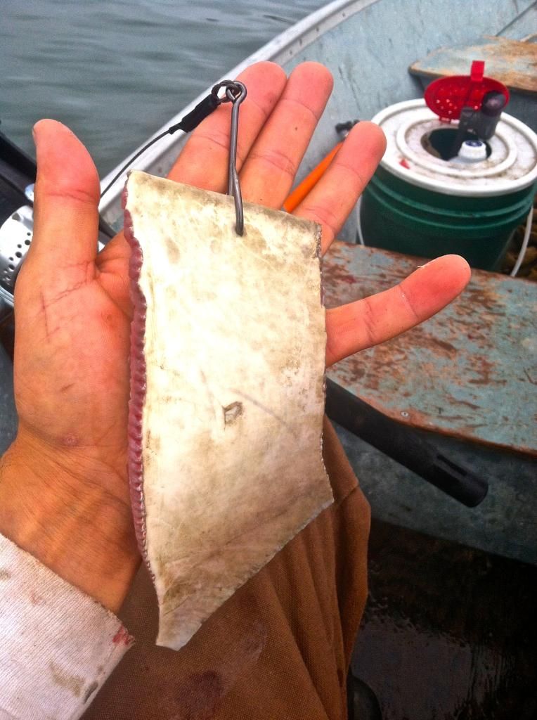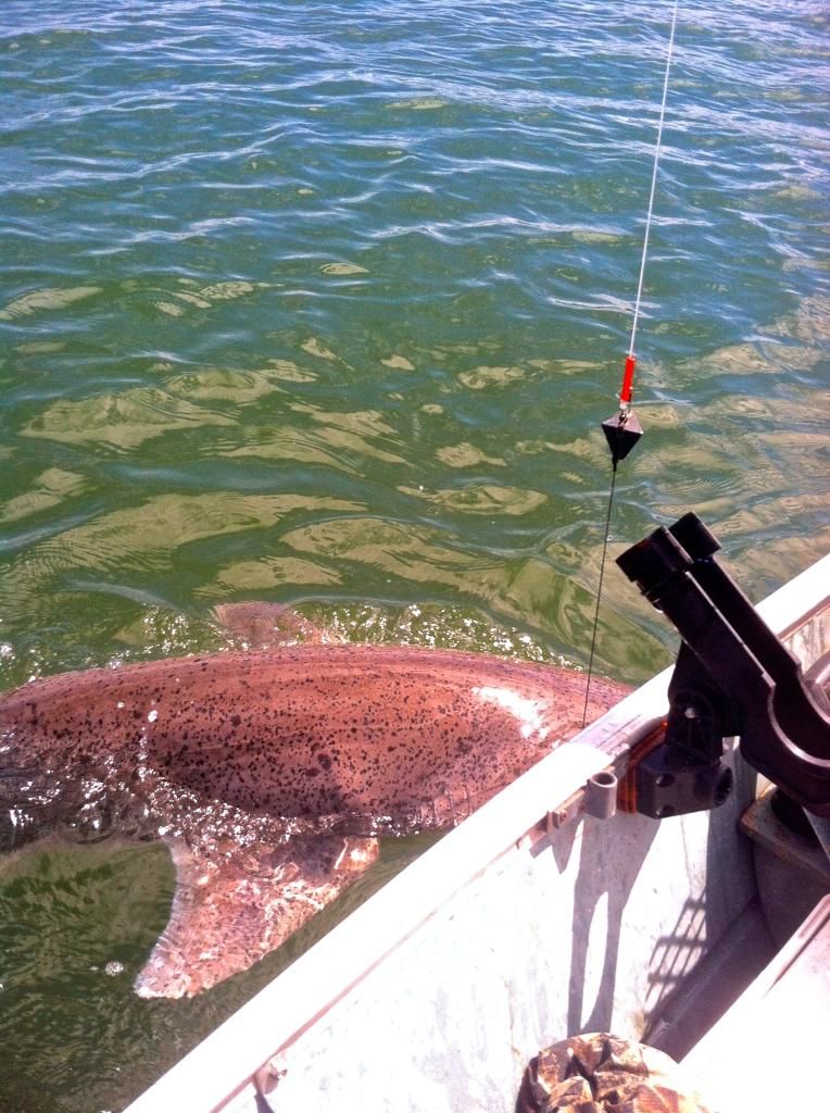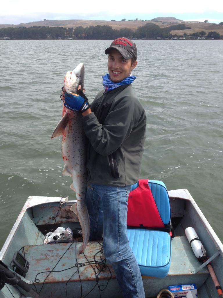 Got on the water about 8 and motored to the bat ray spot. Took out another salt water newbie and quickly had him hooked up to a 40" class ray. After a 10 min battle we had it boat side and he said he was exhausted. After letting it go I checked the tides just to make sure. I found out the tide switched an hour ago so we go burning back to the Sevengill Hole (as fast as a 9.9hp can take you in a loaded 14' boat lol). Get the baits out and land another small ray. This is exactly what I was hoping for, because BIG sevengills commonly eat bat rays. Chop the poor guy up and send him down in the chum bucket. Then I rig up a nice sized chunk of ray and cast it 10' down current of the chum pot.