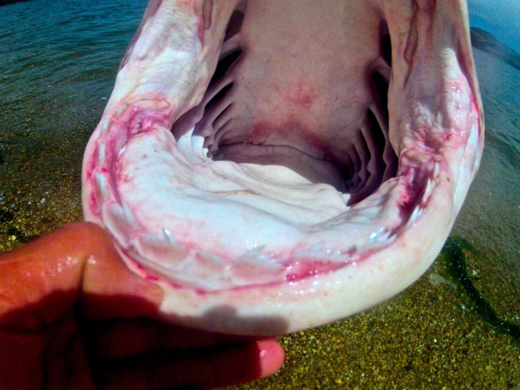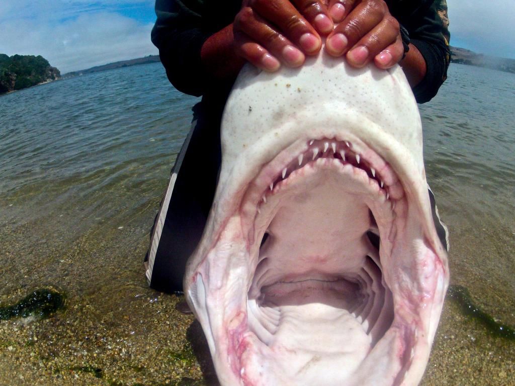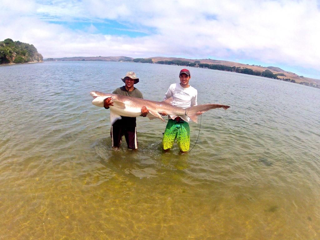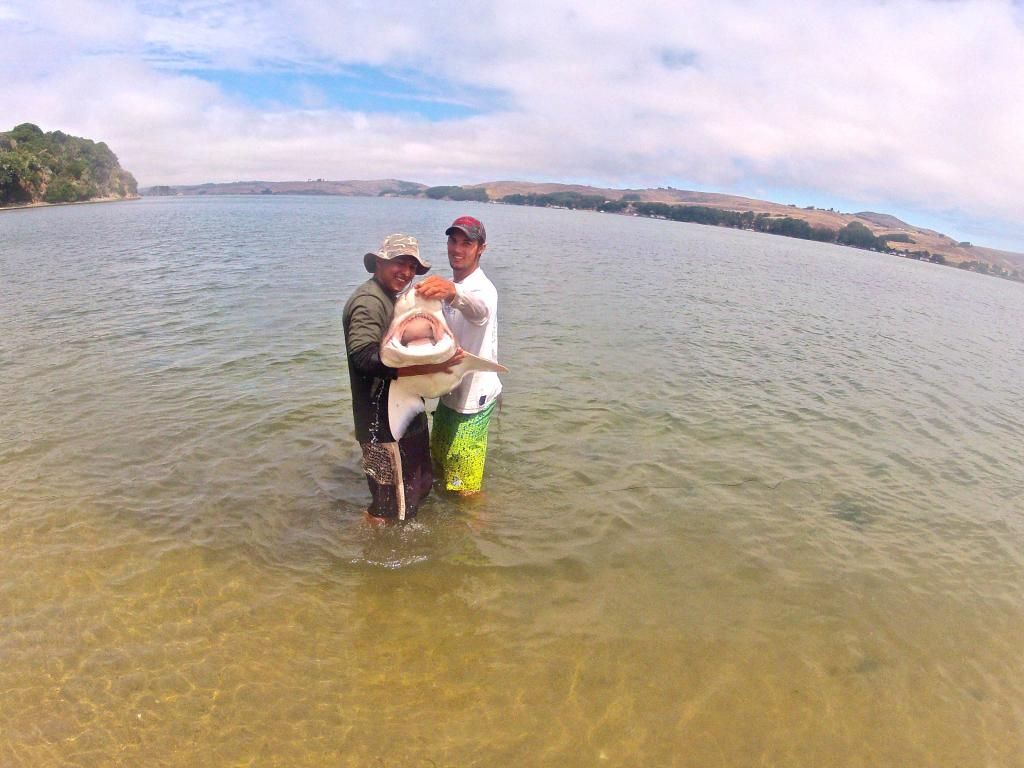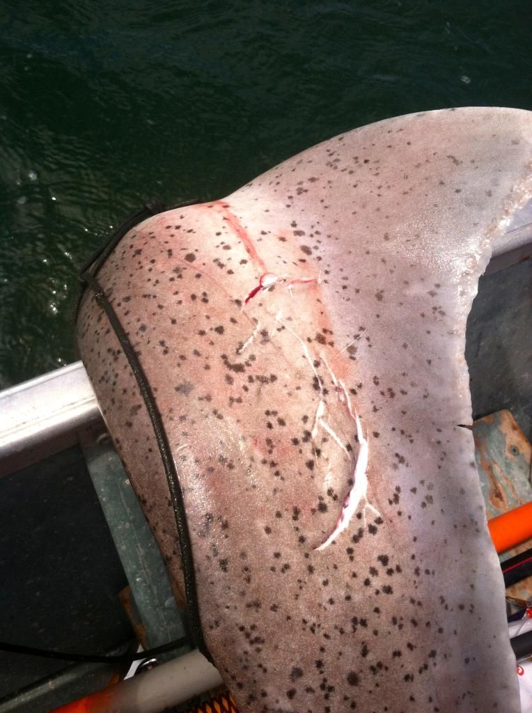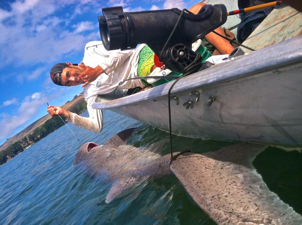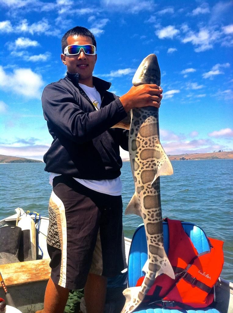 After about an hour lul the rod with the bat ray takes off slow. I let him eat it for about 5sec then hammer the drag and slam him. I fought it easy because I figured only a Sevengill could eat a bait that size, and Max needed time to clear all the rods. Once I get it up I see it is a 5' class Leopard that ate that big bait, maybe a little over enthusiastic. The hook didn't actually hook him, I could see it was just pointed up and was under his jaw cartilage on the top. Since I was just catch and release fishing I gave him some slack and he shook the hook. Rebait with a bigger bloodier piece of ray and send it back out.