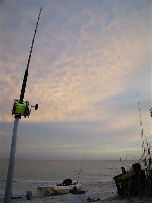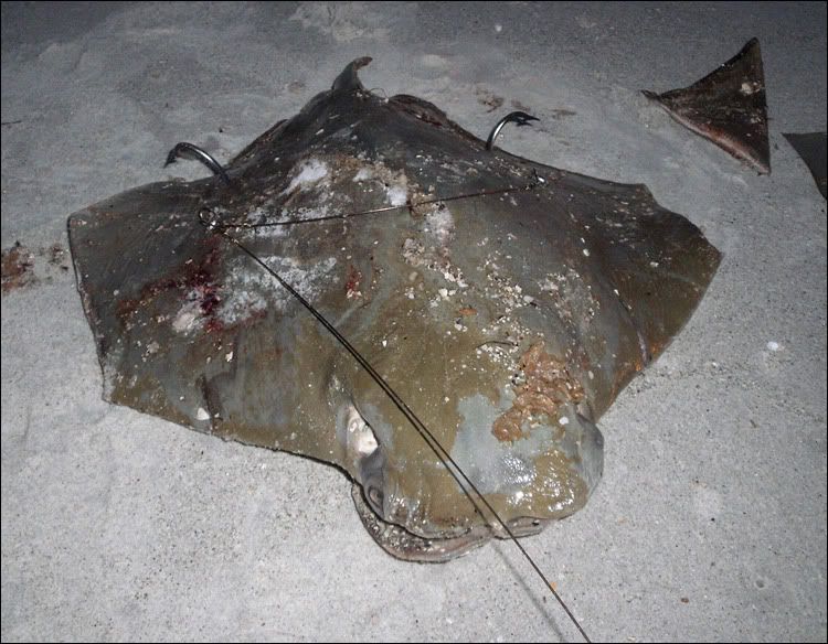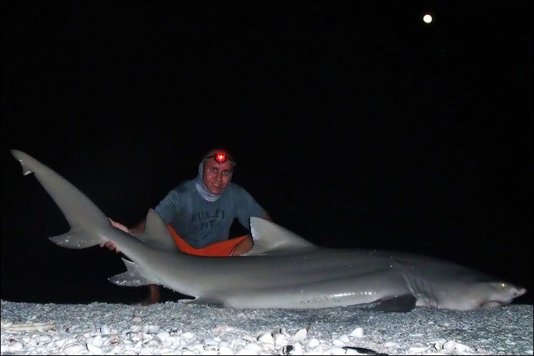 Work and the scorching heat, among other things, have kept me off the water for the better part of the month but lately I've had the itch to go shark fishing from the beach. I called a few people up on saturday but no one wanted to put baits out on such short notice so I headed out solo at 8pm. I rigged up a 15lb cownose ray I caught back in May, paddled it out 350 yards, and dropped it in the warm gulf waters just as the sun went south of the horizon. Not 20 minutes after the drop the 12/0 went off and I was hooked up to a nice fish. Shark fishing alone is quite foolish but you forget about it when the clicker goes off and the adrenaline starts pumping. After a few short runs I got it close to the beach..had a little troubling getting her over the sandbar with the low tide but once I did the incoming waves pushed her onto the beach. Took a quick measurement, 8'2" total length and really thick. My camera didn't want to work right but I got one picture before it died. I really need to get another Nikon. That was the only bait I had so it was a short night. My pursuit for a tiger continues...