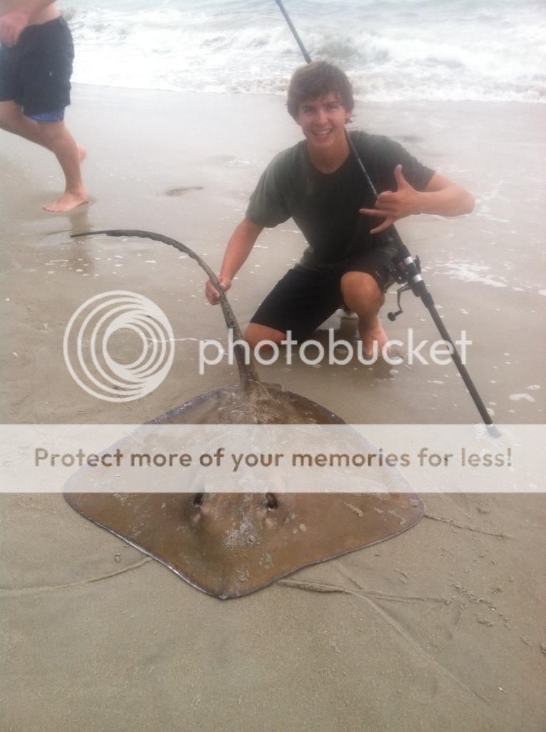 Went down to the jetty the other day to try to catch some blacktips. We only had a few mullet so we were chunk baiting them. I threw out the head of a mullet right off the corner of the T. After cam had caught a few whiting i was about to reel in to rebait, and as soon as i grabbed the rod line started to peel off.. i set up on it and immediatley tightened the drag so he couldnt get into the rocks and break me off... W full drag and my hand trying to slow him down he still managed to shoot into a rock and cut the line.. We arent sure if this was a monster ray or a decent lemon.. no headshakes, but it was only hooked for a few seconds and it fought alot different than a normal ray. Next i put out another chunk of mullet and the rod soon doubled over. As soon as i set the hook I knew it was a ray. The big rays we have been plagued by the past few weeks.. we cant seem to catch a shark on casted gear the big rays have taken over.